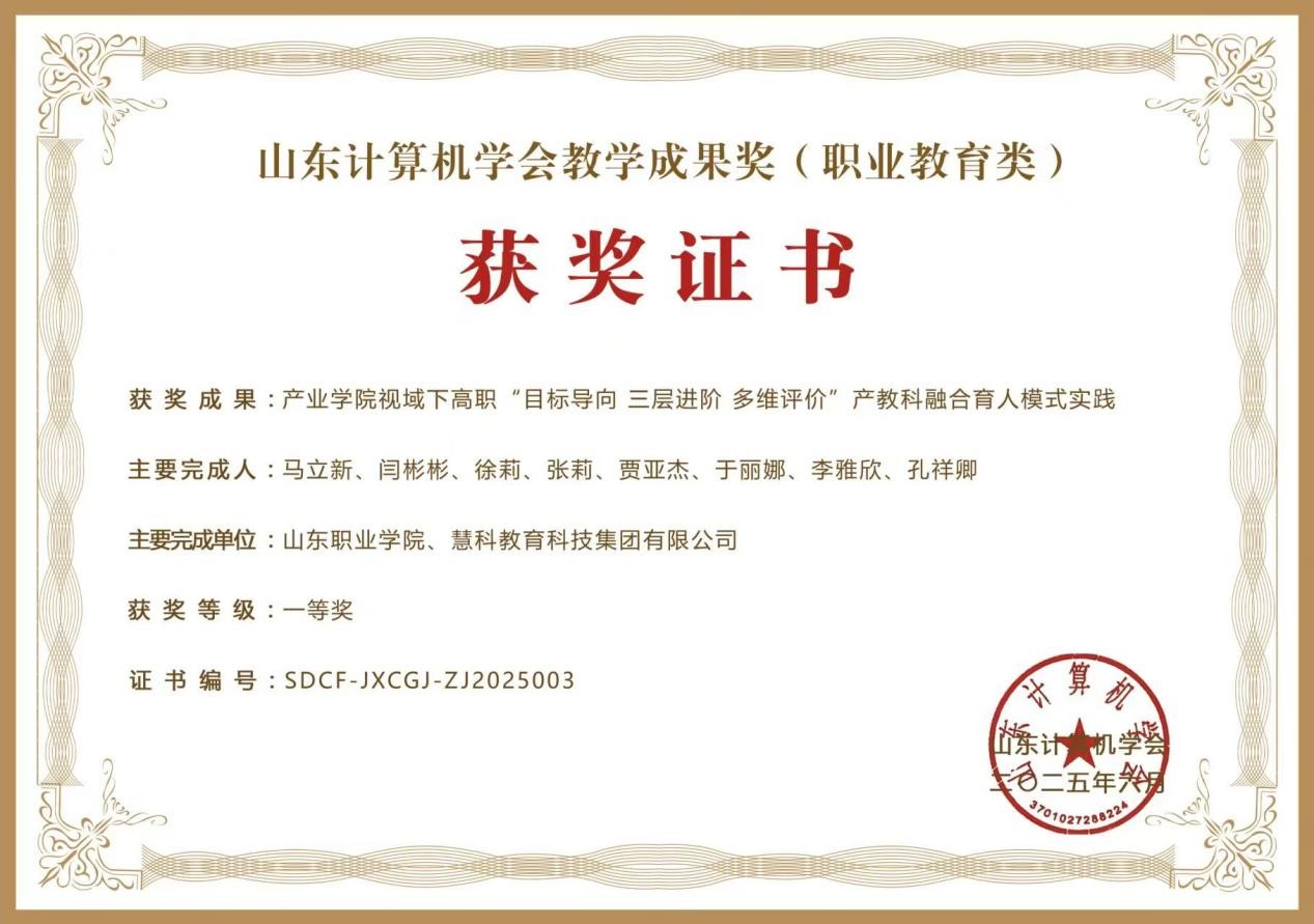 近日,山东计算机学会公布了2025年教学成果奖(职业教育类)获奖名单,山东职业学院新一代信息技术产业学院牵头完成的《产业学院视域下高职“目标导向 三层进阶 多维评价”产教科融合育人模式实践》成果荣获一等奖。这一奖项是对学校在职业教育领域创新实践和育人成效的高度认可。