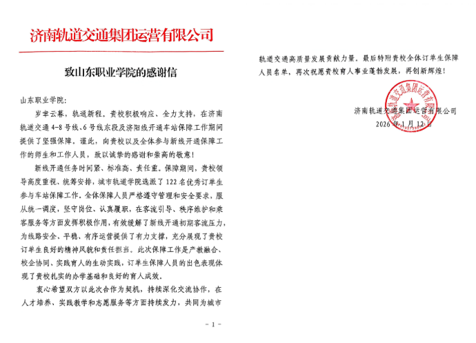 1月12日,我院收到了济南轨道交通集团运营有限公司的感谢信,信中对我参与新线开通保障工作的师生和工作人员表示感谢。