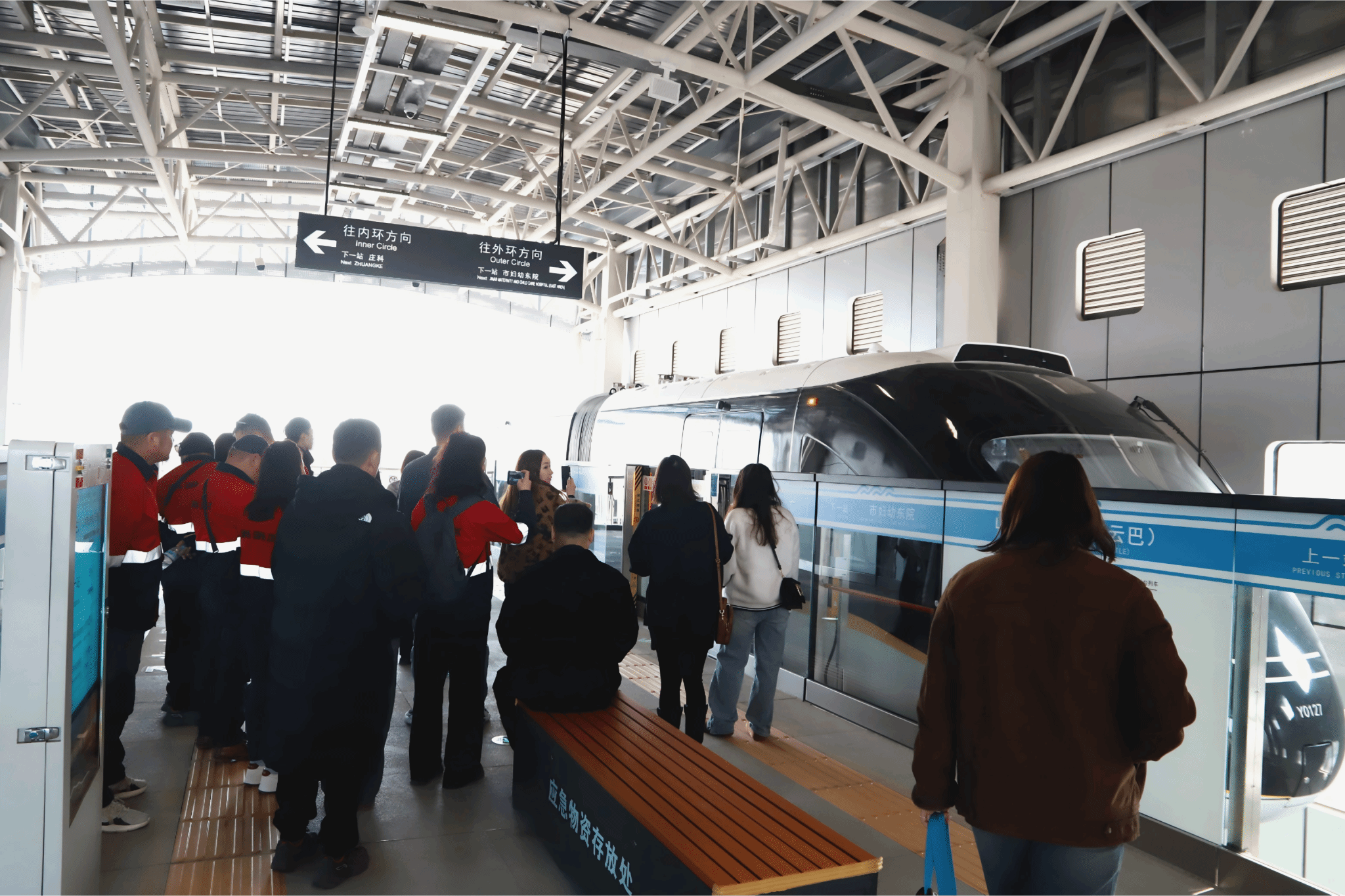 张彤带领学员们进入济南云巴1号线山东职业学院站进行站内设备认知与线路运营体验,学员以“乘客+运营观察者”双重身份体验云巴乘车全流程。从检票候车,到乘车过程中对车厢内导乘标识、座椅布局的观察,学员既掌握了站内核心设备的布置要求,又深化了对轨道交通运营管理的全流程认知。