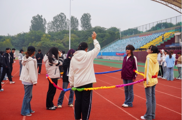 在“盲型方阵”环节,队员们蒙眼协作,在队长的指挥下用绳子围成指定形状。大家分工明确、信任指令,展现出良好的沟通与协作能力。