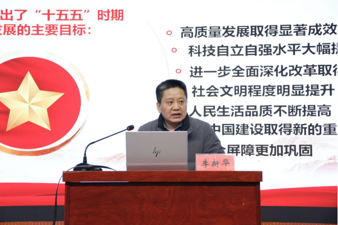 李新华结合教育实际,深入解读了党的二十届四中全会的核心内涵与重大意义,指出要推动全会精神与教育实践深度融合,切实筑牢“为党育人、为国育才”的使命根基;在此基础上系统梳理了“十五五”规划的深层逻辑,并对党的二十届四中全会擘画的未来蓝图进行了全面系统的讲解,从构建现代化产业体系、强化科技自立自强、推进共同富裕、建设美丽中国到扩大高水平开放,清晰勾勒出未来5年至2035年的发展路径与宏伟愿景,强调教育作为国之大计、党之大计,在蓝图实现过程中肩负着培养时代新人、提供人才支撑的重要使命。