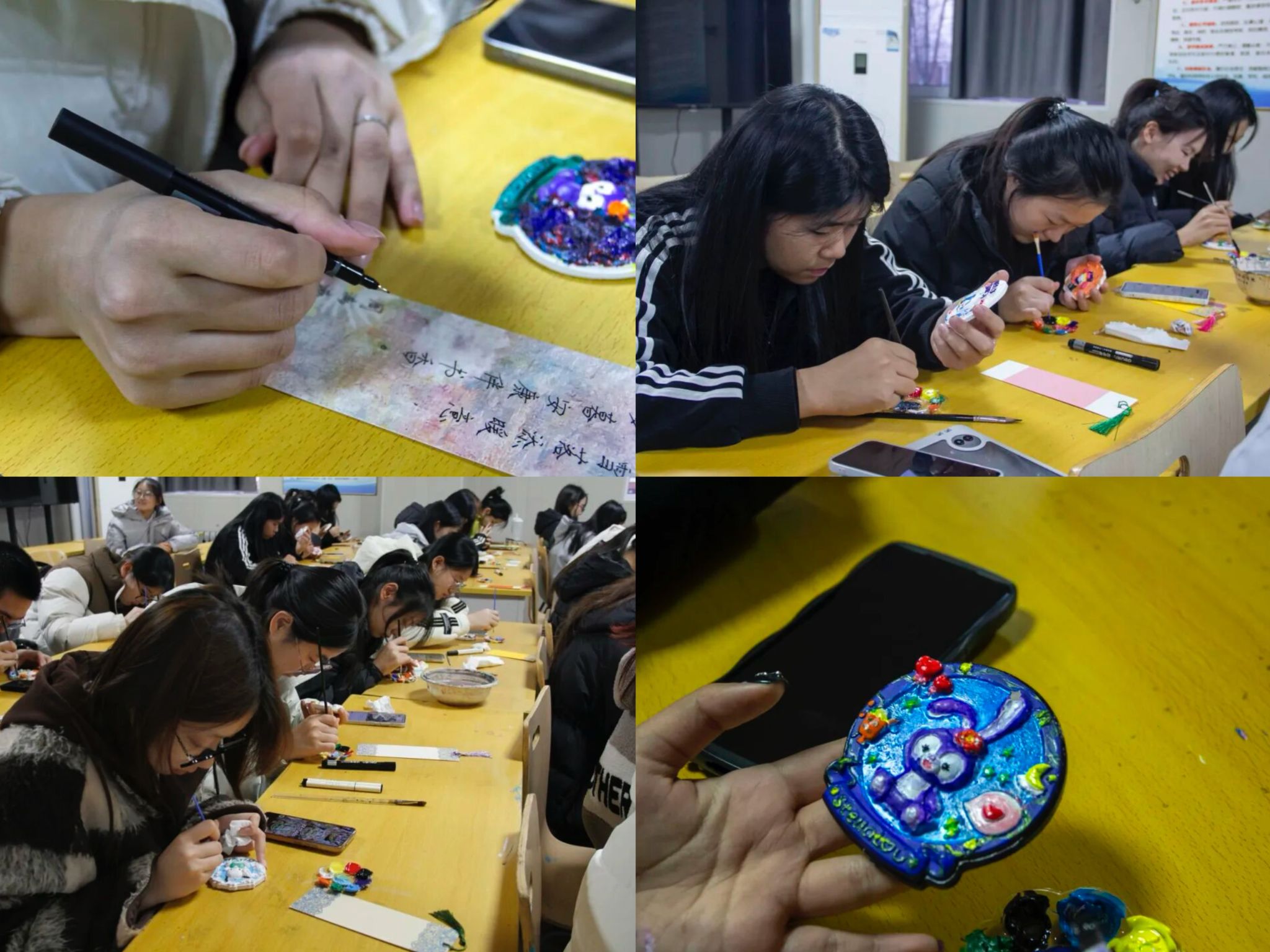 “暖冬祝福语”活动在八号楼党团活动室举行。学生们在书签上书写下冬至祝福,并发挥自己的创意为石膏模型彩绘上色。活动将传统书写与手工创作相结合,让学生们在笔墨与色彩中传递温暖,创作出独具纪念意义的冬日作品。