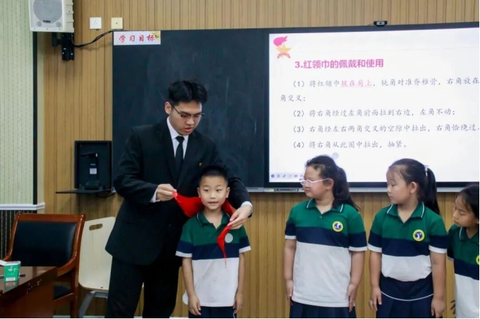 大中小学思政教育一体化背景下,为让红色薪火代代相传、让少先队的光荣使命早早扎根,东岭书院志愿服务队于5月29日走进济南市历城区鸡山小学,开展“东岭青衿承薪火,少年意气筑星河”中国少年先锋队知识普及志愿服务活动,书院部分志愿者参加。