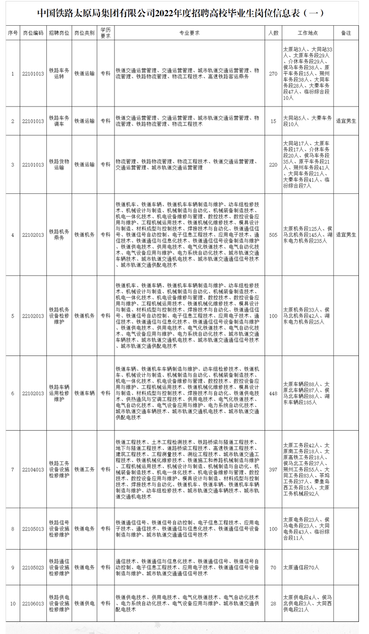 招聘岗位、学历、专业、人数和工作地点等内容详见《中国铁路太原局集团有限公司2022年度招聘高校毕业生岗位信息表(一)》