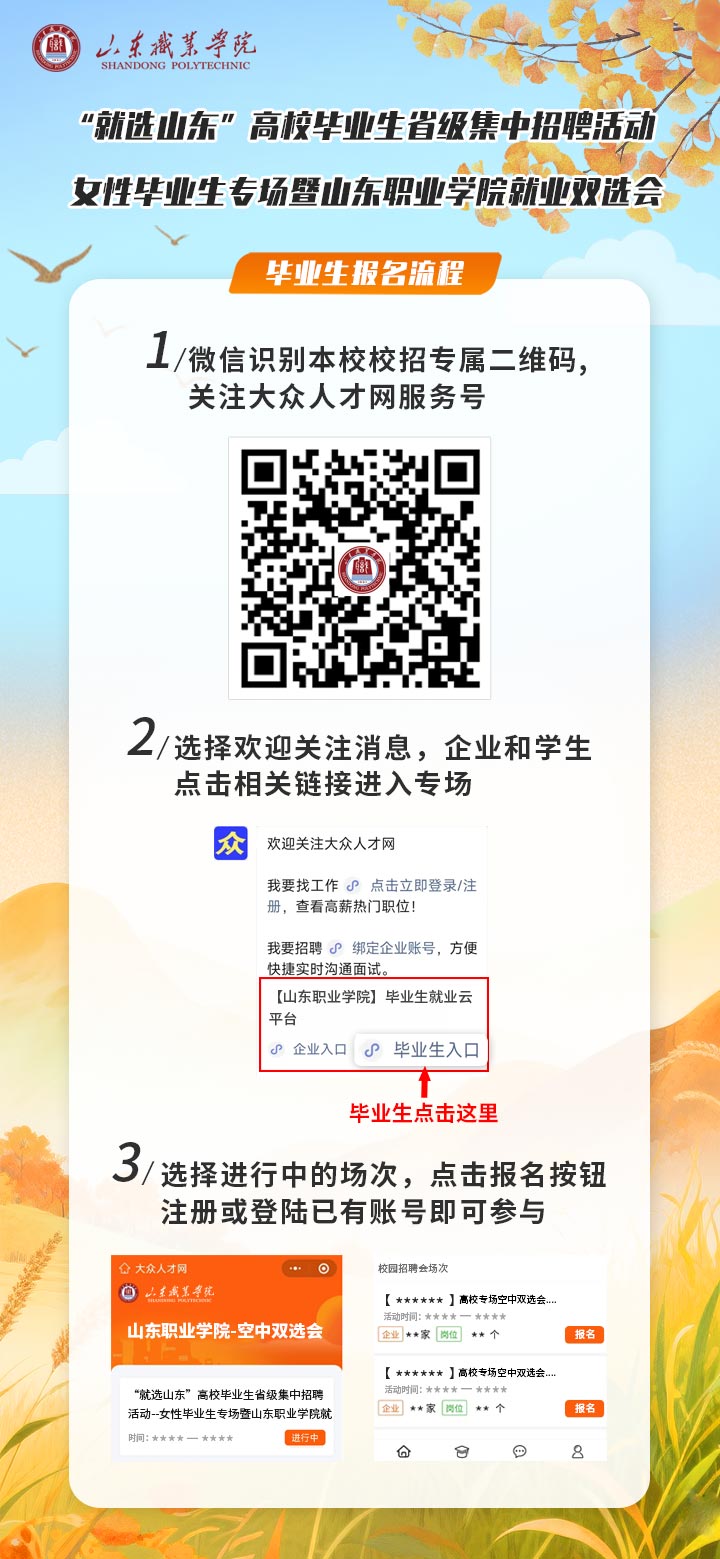微信报名入口:微信扫描页面下方双选会二维码或微信搜索“大众人才网”关注公众号,企业和毕业生分别点击相关按钮进入学校专场,点击报名按钮,注册或登录已有账号即可直接参与。