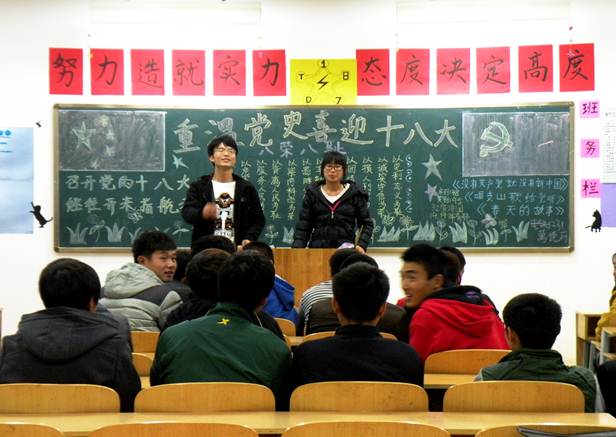 主题班会上,有的班开展演讲和朗诵活动,有的班用图片展示了中国共产党一大至十七大的召开历程,还有的班则通过讨论的形式围绕即将召开的十八大加强政治理论学习。同学们表示,回顾党的艰辛发展历程是对今天幸福生活的肯定。在今后的学习生活中,更要珍惜这来之不易的大学时光,以积极进取的心态刻苦努力,扎实学习,以优异成绩为祖国的明天贡献自己的一份力量。