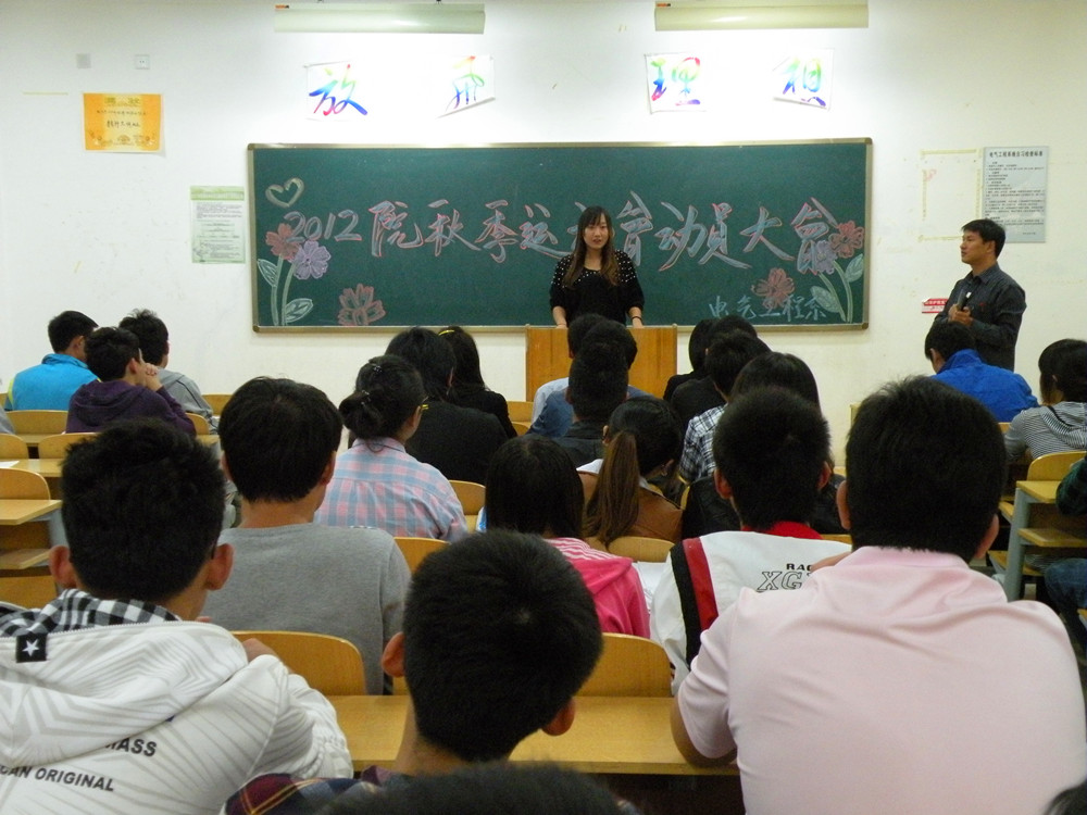 2012年秋季运动会临近,为提高运动员积极性,统筹安排活动,10月15日晚,电气工程系召开2012年院秋季运动会动员大会。电气工程系团总支书记赵龙出席动员会,学生会和自律会全体干部成员,各项目负责人及运动员代表参加大会。