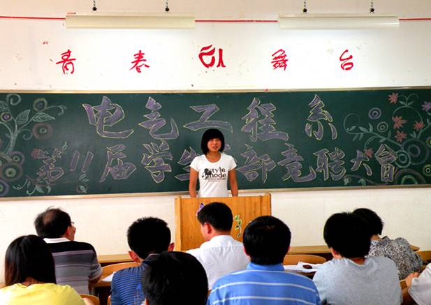6月5日-6月20日,电气工程系在A510举办第十一届学生干部竞聘大会,电气工程系党总支书记徐晓东、学工办主任符娟、团总支书记赵龙、辅导员李亚飞和李晓理出席了竞聘大会。来自全系11个班级的近百名学生参加了此次竞聘。会议由团总支副书记夏雯灏主持。