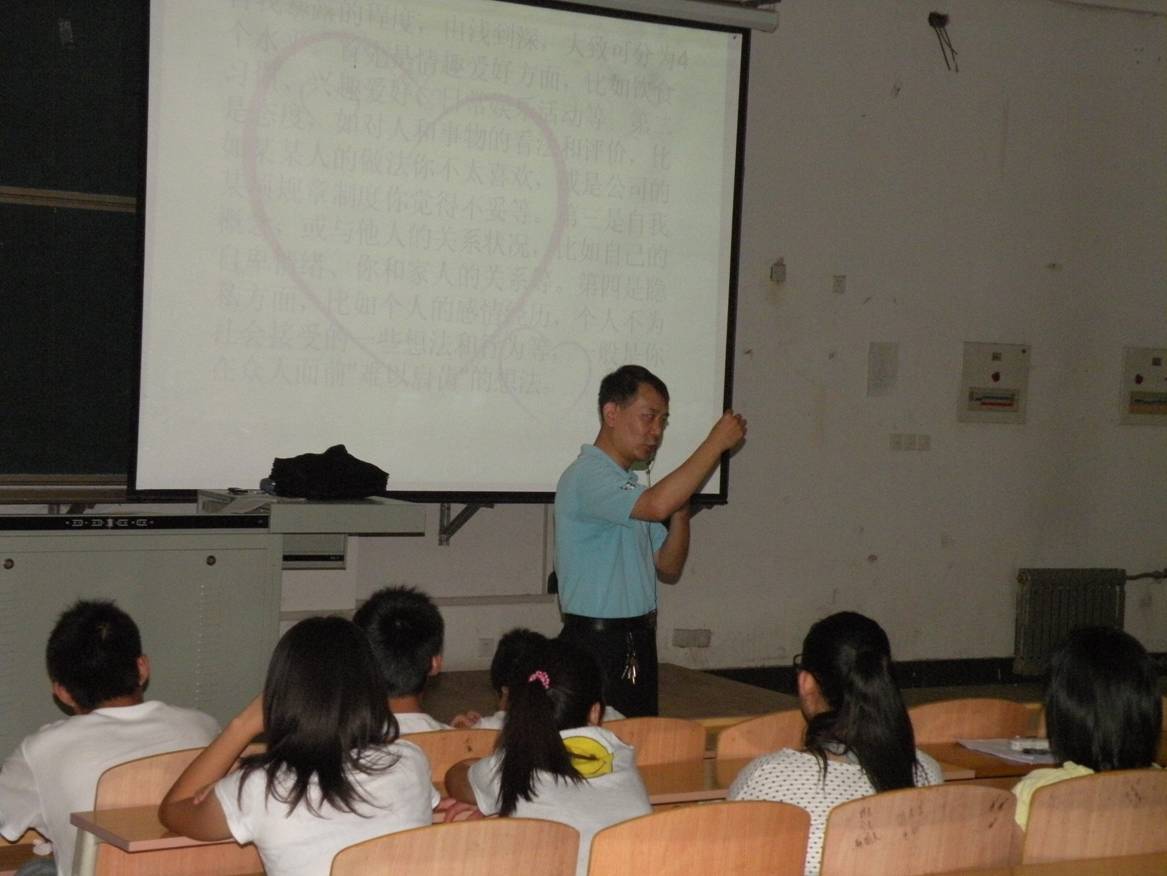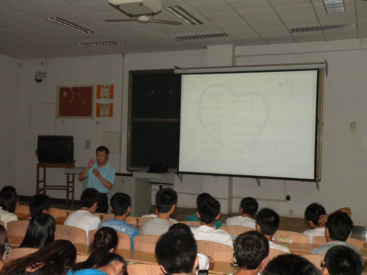 侯教授用一句“在天愿作比翼鸟,在地愿为连理枝”拉开了活动的帷幕。一场别开生面的“大学生爱情中的心理健康”讲座,从现场开展的观看视频与欣赏音乐,到随后的观摩周恩来总理的爱情历程,让聆听讲座的老师和同学们深切感受到养成良好的人际交往能力,树立正确爱情观对于当代大学生的重要性。随后,侯老师诙谐幽默的小笑话,将在场同学的情绪推向了高潮,博得阵阵掌声。