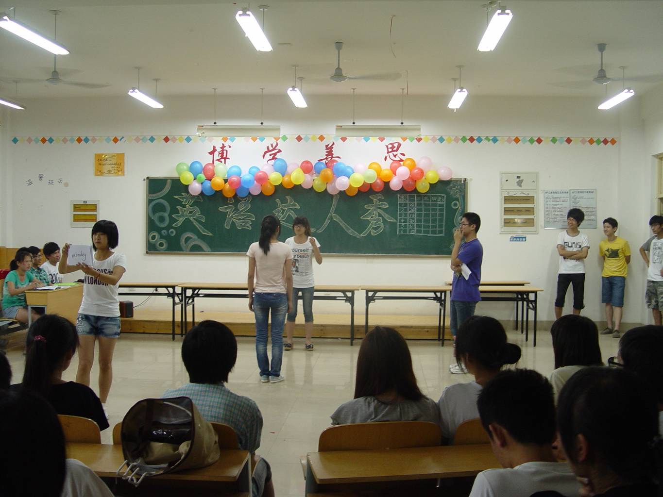 本次比赛由笔试和表演两部分。首先通过笔试海选出前六名,再通过四个不同的环节累计得分评出前三名。第一环节“争分夺秒”,选手们根据纸条上的数写出相应字母的单词,不仅考验参赛选手对单词的熟悉程度,还给眼明手快的选手一个脱颖而出的机会。第二环节“你演我猜”,选手可以挑选一个朋友来助阵,不是同窗密友,肯定要输在默契上。第三环节的“才艺展示”,充分锻炼了同学们英语口语能力与现场表演能力。最后环节“反败为胜”,每个代表队选择不同分数的题进行回答,答对加分,答错则减去相应的分数。最后,比赛在掌声中圆满结束。