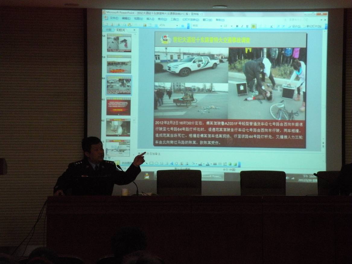 杨队长将此次讲座分为六个大部分,分别运用了大量的事故图片、数据和案例,围绕着行人事故、非机动车事故、拖拉机事故、大货车事故、酒后驾驶事故以及摩托车事故等案例,为我们讲解了常见道路交通违法行为以及如何规范驾驶员安全驾驶等相关知识,并且告知我们交通安全不可偷工减料,生命安全第一位。同时,他还结合实际情况,对安全驾车的注意事项、如何预防交通意外的发生和相关交通的法律法规等相关的交通知识对我们进行了详细讲解。杨队长让我们看了一些世纪大道和经十路重特大交通事故的图片,画面触目惊心,醉酒驾驶、肇事逃逸、超速行驶、违法占道等,都成为了马路杀手,凄惨悲痛的画面至今都历历在目。
