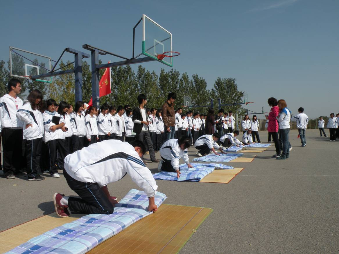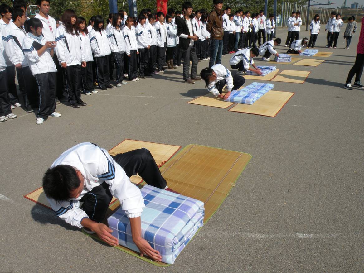 “五分钟计时,预备,开始”,随着一声嘹亮的口号,,妙趣横生的叠被子大赛拉开了序幕。此次叠被子大赛在常规的叠“豆腐块”的基础上,增加两人三足跑环节,参赛选手可邀请一名观众,把腿绑在一起,在听到口令后,从50米外跑到自己叠被的区域,解开绳子然后开始叠被子。整个赛场也因增加了这一环节而变的沸腾起来,呐喊声,欢笑声,庆祝声响彻秋日的蓝天。万众瞩目的选手们快速安全的出发,有条不紊的整理被子,灵活的手在被子之间跳跃,不敢有丝毫的马虎。转瞬间,一块块蓝色的“豆腐”映入眼帘,选手们骄傲的站在被子旁,向评委展示自己的成果。最终,比赛在阵阵掌声中落下帷幕。