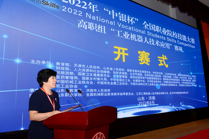 8月22日,2022年“中银杯”全国职业院校技能大赛高职组“工业机器人技术应用”赛项开赛式在我校图书行政楼西报告厅举行。山东省教育厅职业教育处一级调研员孟令君,山东职业学院党委书记高磊,赛项执委会副主任、山东交通职业学院党委副书记、院长王心,大赛合作单位中国银行股份有限公司济南分行党委委员、副行长郝学彬,赛项专家组长范进桢,裁判长熊越东,监督仲裁组长蒋晓刚,赛项执委会委员、江苏汇博机器人技术股份有限公司副总裁崔晓辉,赛项执委会委员、武汉华中数控股份有限公司教育事业部副总经理宁柯出席开赛式。开赛式由学校副院长祝瑞花主持。