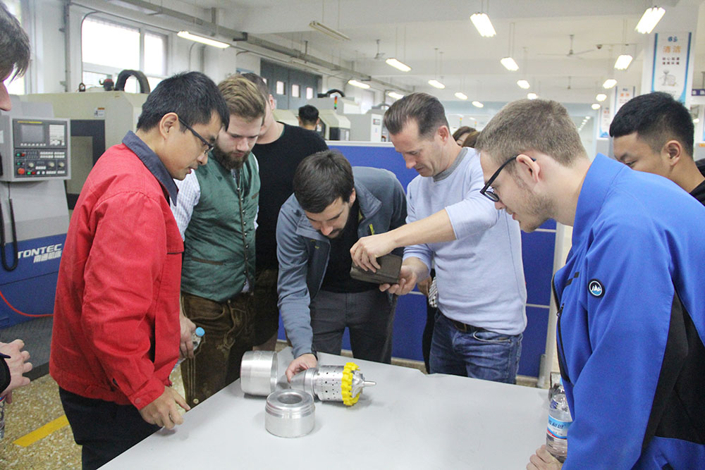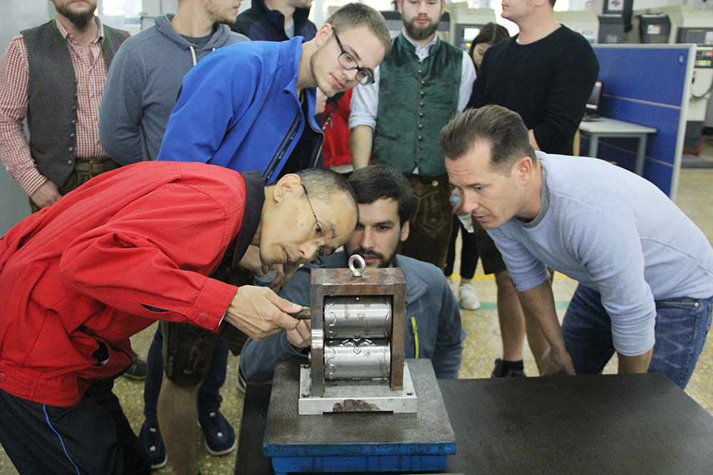 合作加工鲁班锁,增进友谊共发展。交流期间,我系组织特长生同学同交流团师生开展合作活动,共同设计制作车辆项目“鲁班锁”。首先,指导老师将参加人员进行混合分组,三人一组,共分四个小组。随后,中德同学合作绘制“鲁班锁”零件图,大家分工明确,干劲十足,合作的十分默契。最后是对工件的实际加工,周老师在上机前先给大家介绍了我国普通铣床的操作方法及注意事项,让交流团师生都熟悉了铣床的操作方法。经过一天的共同努力,克服加工中的重重困难,每个小组最后都完成了“鲁班锁”的加工。