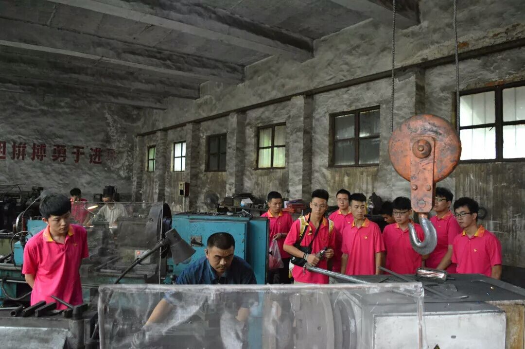 随后,服务队员在村支部书记的带领下来到拥有四十年历史的村办田友农机机械厂参观学习。队员们在老师傅的操作下了解到农机零件从毛坯到产品的整个生产过程。在参观过程中,大家发现这个拥有悠久历史的机械厂工作条件很是艰苦,生产机械也相对比较落后,队员们结合学习的专业技能和实操经验,向工人普及了新型机床的操作技术,老工人师傅听后十分欣慰,握住队员的手语重心长的说:“我们老了,时代的交接棒已经落在你们手上,你们以后如果从事制造业,要记住抓住机遇,赢得挑战,耐住寂寞,大有作为。”随后,队员们向工厂负责人介绍全国各地都在进行新旧动能转型,各级政府鼓励老牌产业开展创新、转型的大形势,并针对工厂创新提出自己的建议,为工厂转型升级贡献新思想。