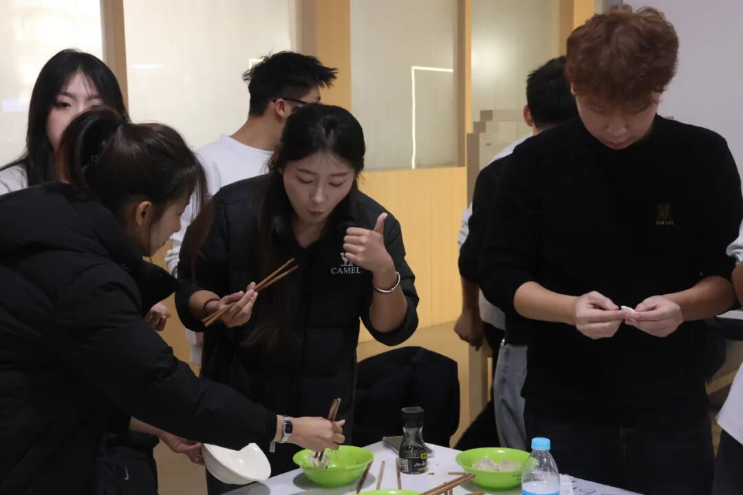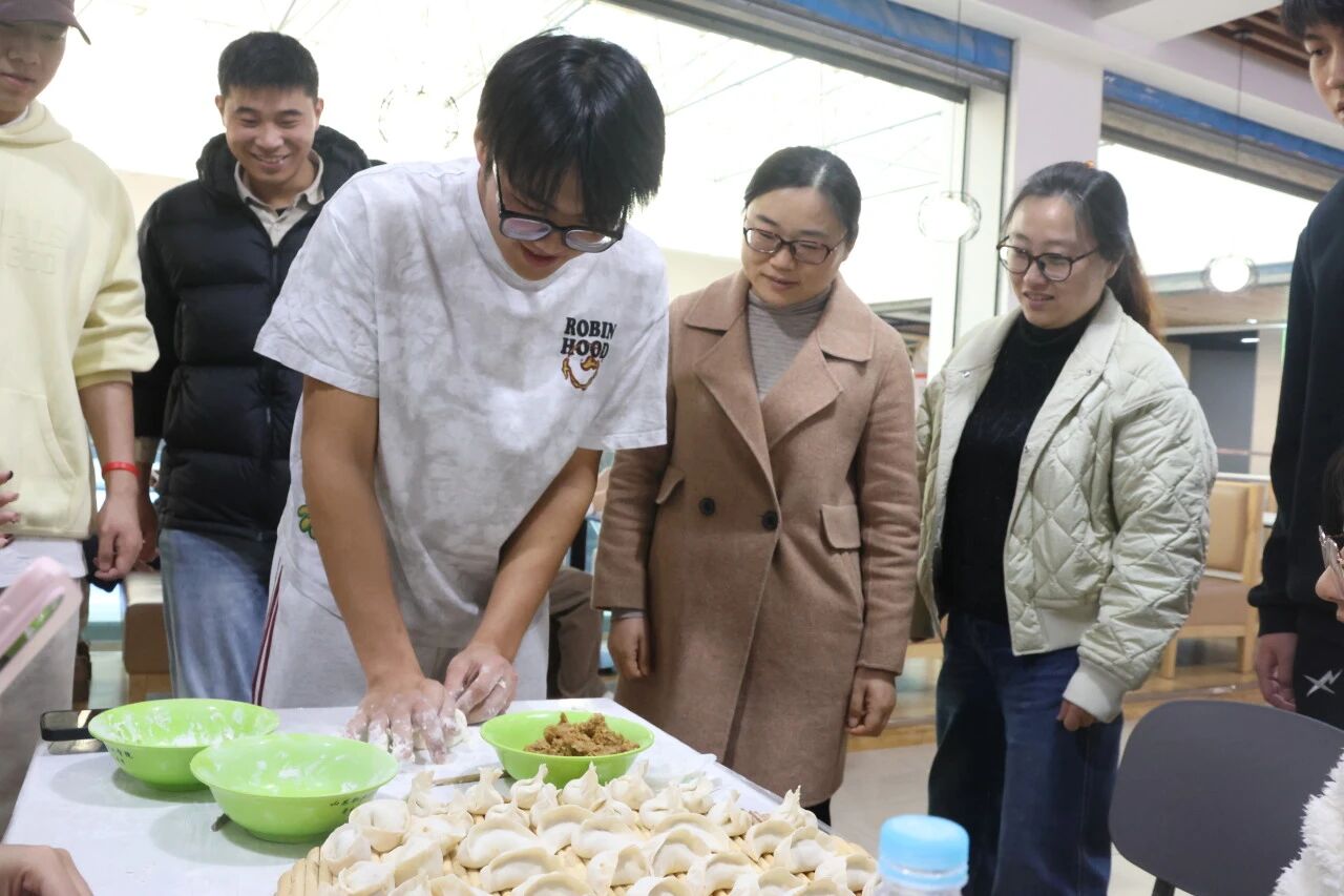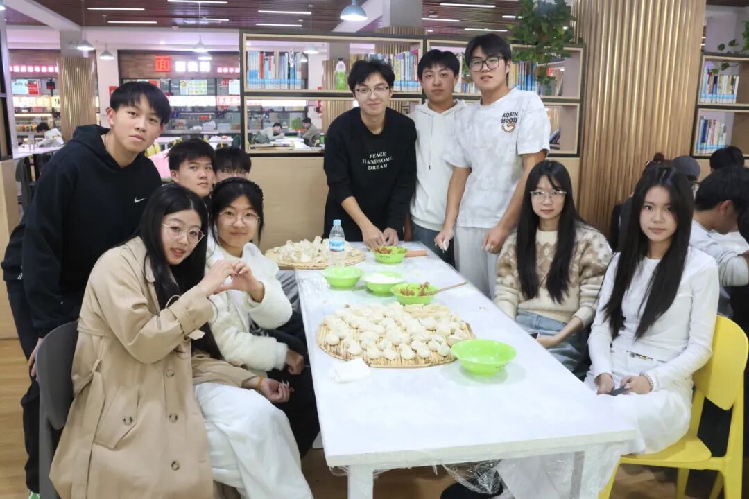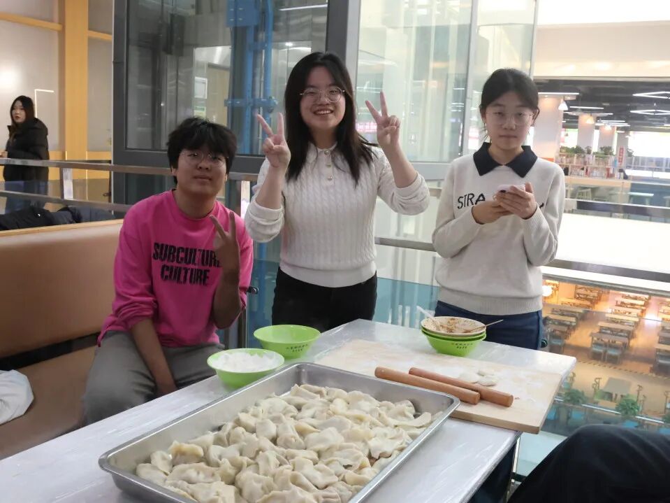 活动在温馨有序的氛围中展开。现场同学组成多个小组,分工明确、配合默契:揉面、擀皮、包捏,各环节衔接流畅。许多同学虽是初次尝试,但在同伴的细致指导下,很快掌握了技巧。活动期间,大家一边交流家乡的冬至习俗,一边切磋包饺子的手艺,场面热烈而融洽。当一盘盘热气腾腾、饱含心意的饺子端上桌时,同学们共同品尝劳动成果,分享着亲手制作的美食与温暖。