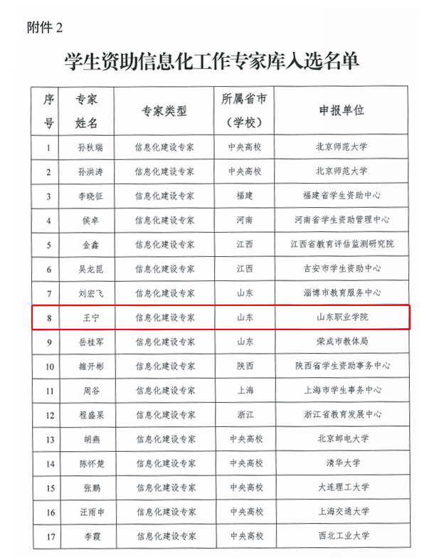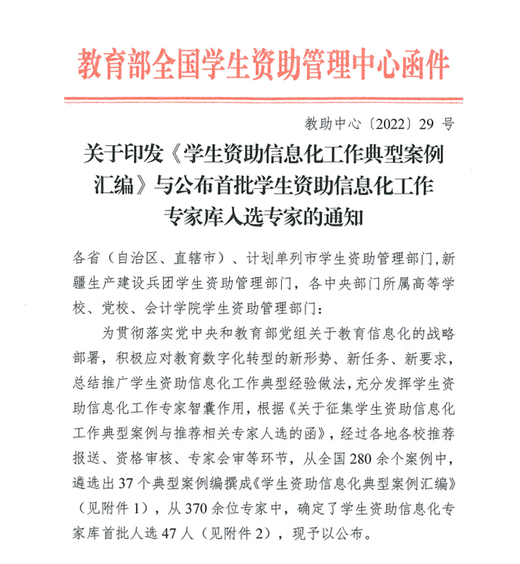近日,教育部全国学生资助管理中心下发《关于印发<学生资助信息化工作典型案例汇编>与公布首批学生资助信息化工作专家库入选专家的通知》(教助中心〔2022〕29号),我校《用信息化推动资助工作“有的放矢”》案例成功入选,学生工作处王宁入选专家库。