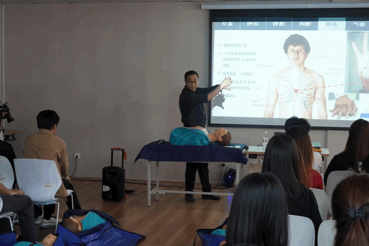 培训中,山东省公共卫生临床中心南丁格尔志愿服务队成员、公卫中心急诊科主任魏志超为大家深入讲解并示范了心肺复苏术、海姆立克急救法及AED的使用方法等急救技能。