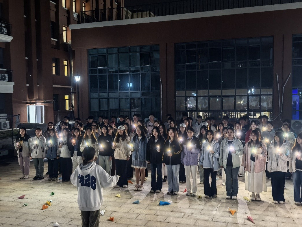 活动当晚,五四合唱团的百余名同学齐聚于书院男女生宿舍楼中间的U型区。当歌声响起,靠近U型区的宿舍迅速响应,南楼宿舍迅速关闭单数宿舍灯光,北楼宿舍默契熄灭双数宿舍灯光,灯光的有序变化营造出独特氛围。与此同时,宿舍内的同学们纷纷来到窗边,与U型区观众默契打开手机手电筒,随着音乐尽情挥舞。点点星光交织闪烁,与嘹亮的歌声交相呼应,个体微光汇聚成青春海洋,生动诠释了集体主义的磅礴伟力。同学们通过对《启航》与《明天》两首歌曲的演唱,不仅表达了青年学子对未来的憧憬与向往,也抒发了对五四先驱的深情缅怀与告慰。歌声在夜空中久久回荡,余音绕梁,串联起了历史精神与时代脉搏。