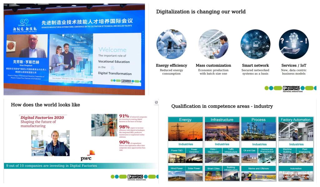 德国菲尼克斯电气集团公司国际教育合作负责人/德国职业教育联盟副主席克劳斯·亨斯巴赫的专题报告以《职业教育在数字化转型中的重要作用》为题,以数字化转型为背景,阐释了数字化转型对制造业和从业者的影响,从职业教育适应性角度出发,围绕多语言编程、协同化工作,在智能系统、电气化、网络和自动化领域,分析了如何满足数字化转型背景下的市场需求,阐明了职业教育在技术变革中的重要作用。