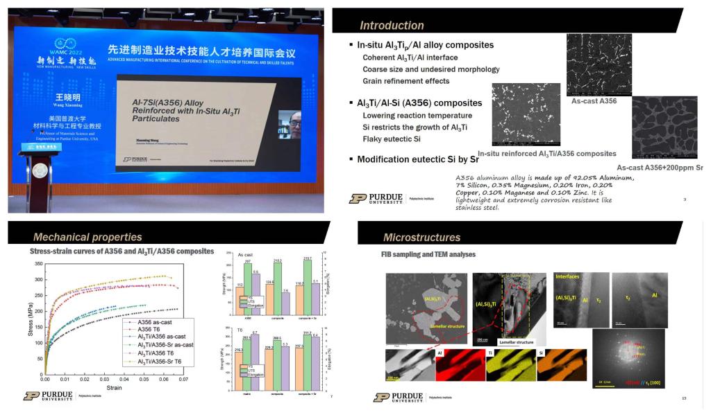美国普渡大学材料科学与工程专业教授王晓明的专题报告以《制造新材料-原位钛化铝颗粒增强铝硅合金的制备与性能研究》为题,围绕原位钛化铝颗粒增强铝硅合金的制备、组织及性能,通过对实验结果的分析,提出了这种复合材料的微观结构、EDS结果、机械性能等,为我们展示了这种新型复合材料的发展潜力,启示了未来智能制造领域新材料的研发方向。