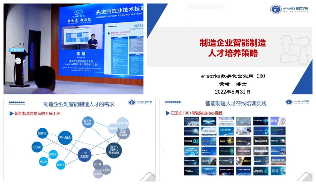 中国智能制造专委会专家/e-works数字化企业网总编、CEO黄培的专题报告以《制造企业智能制造人才培养策略》为题,围绕制造企业对智能制造人才需求、在线培训体系建设与实践等方面作了精彩分享,分析了当前制造业数字化转型的趋势和挑战,提出了智能制造对人才能力的要求,为企业培养实战、实效、实在的智能制造专业人才提供了借鉴与指导。