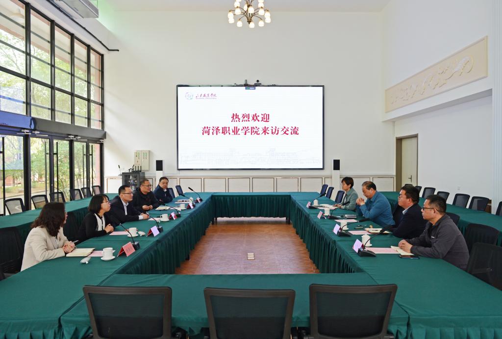 王朝景对我校的热情接待表示感谢,对我校取得的办学成绩给予充分肯定,并介绍了菏泽职业学院的办学历史、学生工作、创新创业教育等方面情况。