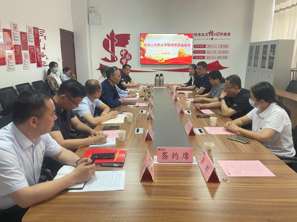 座谈结束后,教务处党支部、职业高等教育研究院党支部和枣庄职业学院机关第二党支部,创新创业学院与先进技术应用与创新中心党支部和枣庄职业学院创新创业党支部,总务处党支部和枣庄职业学院化工制药党支部,机场学院筹备办党支部与枣庄职业学院新能源与汽车工程系党支部,分别签署《党建联创共建协议书》,本着优势互补、共谋发展的原则,努力实现党建引领推进职普融通。