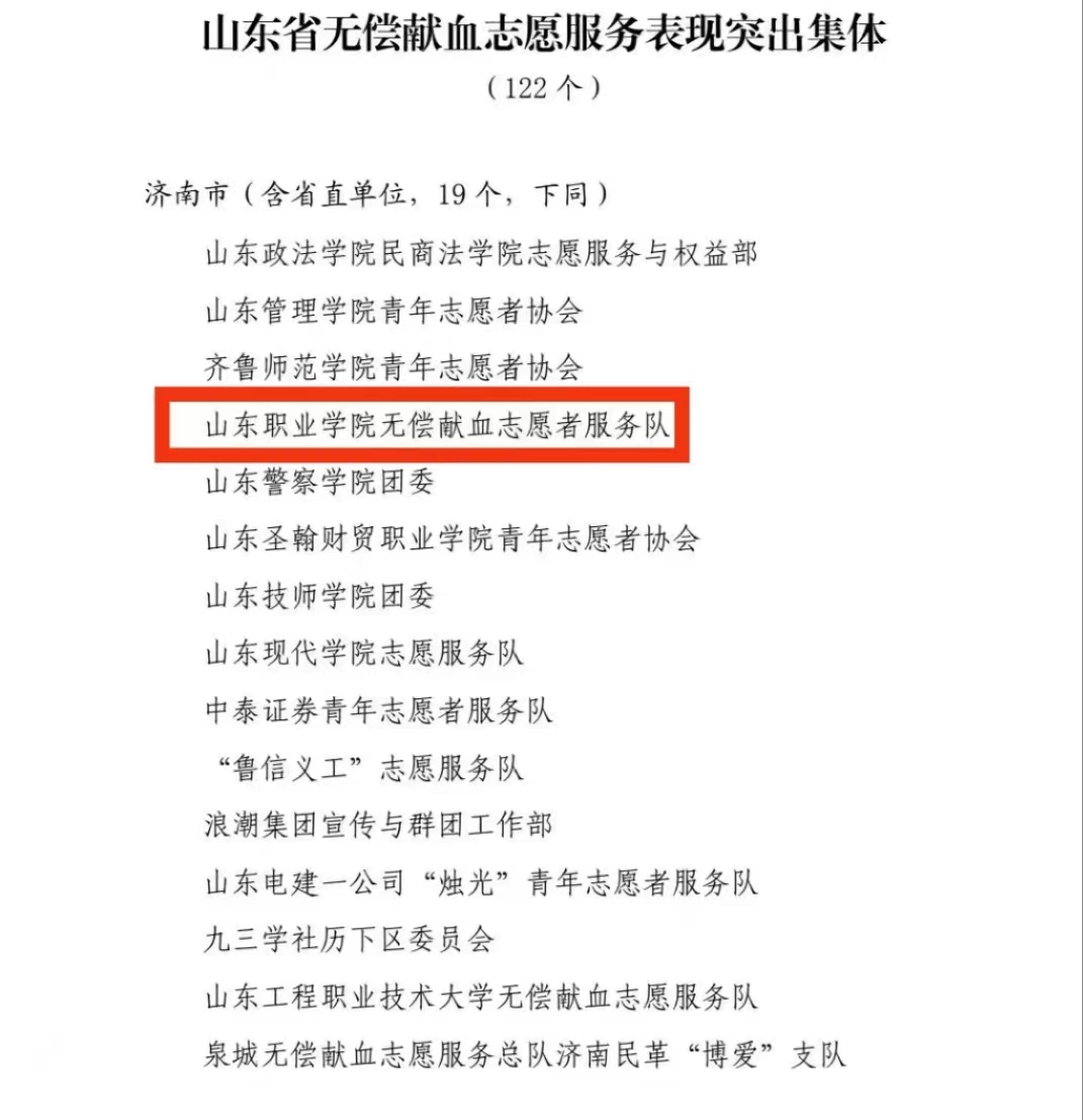 作为“齐鲁公益献血联盟”成员单位,学校一直高度重视无偿献血公益事业,并专门组建了“山东职业学院无偿献血志愿者服务队”,现已打造成为一个特色品牌。学校自2013年参与献血活动以来,服务无偿献血活动20余次,组织师生累计献血量超4万cc 。尤其是疫情期间,全省血库告急,学校克服种种困难,在校园内组织无偿献血5次,累计献血量达9000cc。