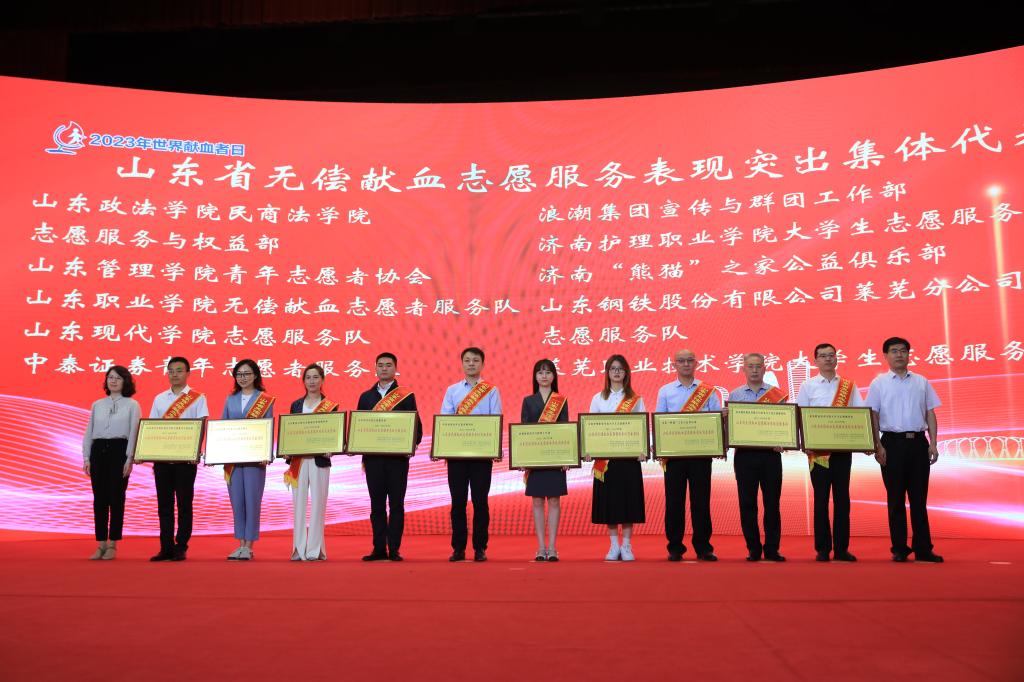 6月14日,由山东省卫生健康委举办的山东省2023年世界献血者日宣传活动在济南南郊宾馆举行。现场对2021-2022年度山东省无偿献血工作表现突出的集体及个人进行了表彰,我校的山东职业学院无偿献血志愿者服务队荣获“山东省无偿献血志愿服务表现突出集体”荣誉称号。