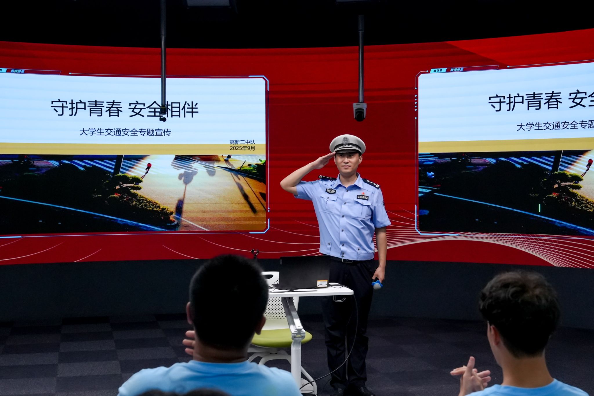 翟羽佳以《守护青春 安全相伴》为题,介绍了大学生交通安全现状,普及了大货车视野盲区知识,播放了典型事故视频。强调步行安全要做到“三看二不两注意”,骑行安全要做到“一盔二证三规范”,乘车安全要做到“三查二系一拒绝”,提醒学生要懂得拒乘黑车,做好“一盔一带”。他从法律成本、经济成本、职场成本、时间成本、家庭成本等方面分析了酒驾醉驾的代价,让大家受到警示和教育。他指出,交通安全无小事,希望同学们牢记交通法规,自觉抵制危险行为。