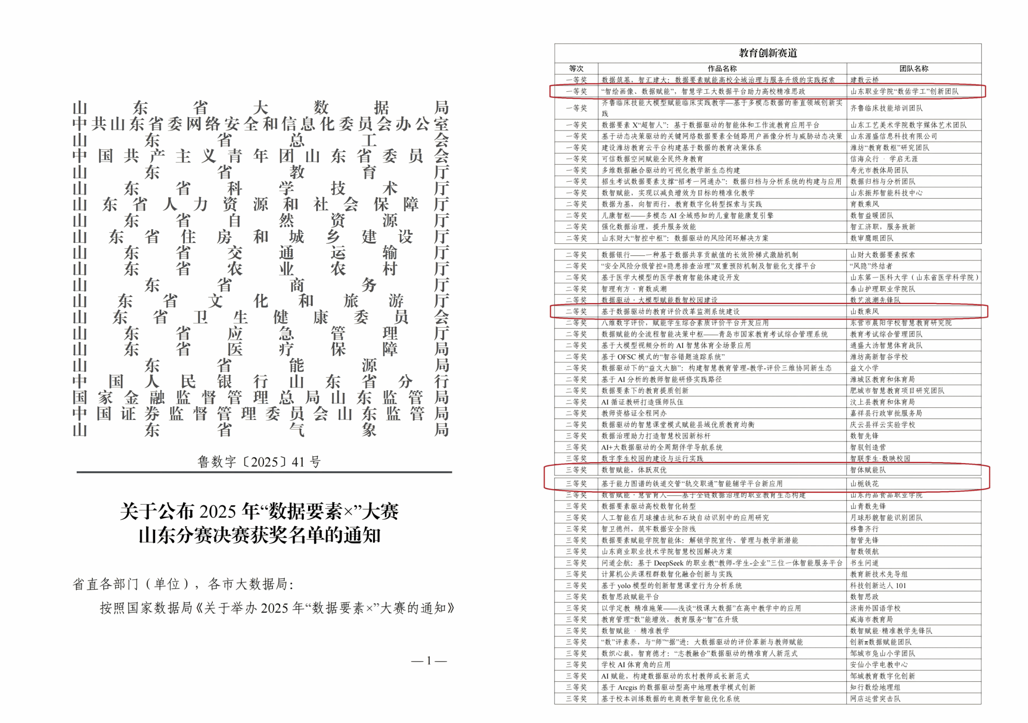 近日,2025年“数据要素×”大赛山东分赛决赛圆满落幕。我校在教育创新赛道斩获4项荣誉,充分展现了学校在数据驱动教育创新领域的实力和成果。