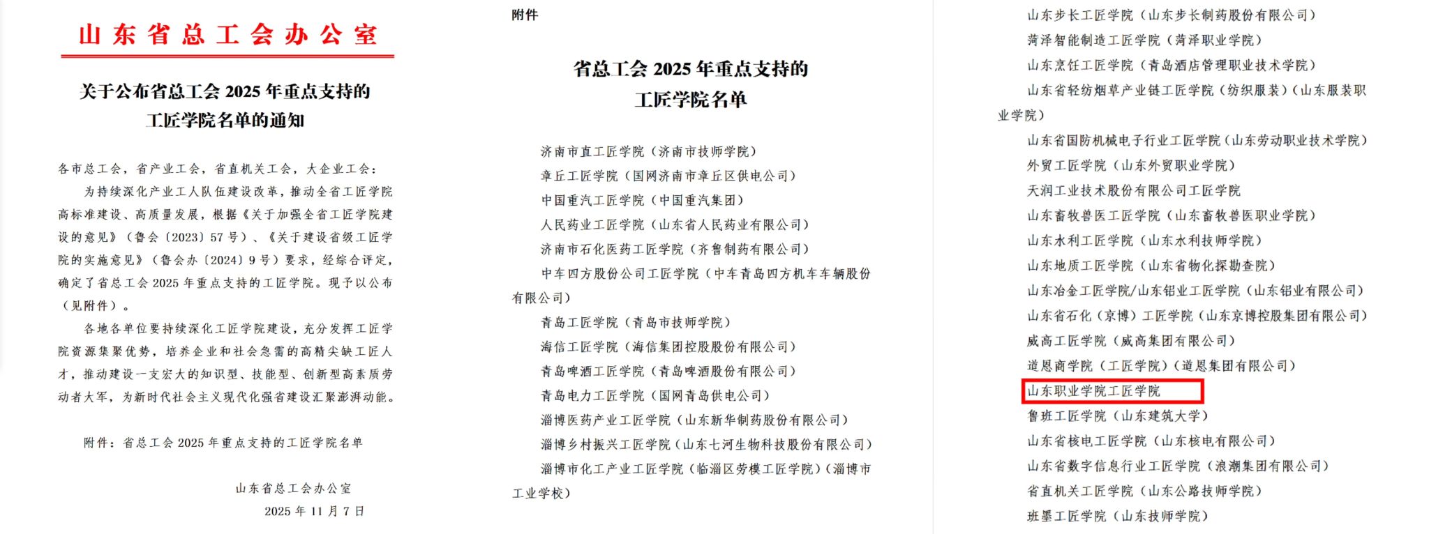 近日,山东省总工会办公室印发《关于公布省总工会2025年重点支持的工匠学院名单的通知》,我校工匠学院凭借扎实的建设基础、鲜明的育人特色和显著的产教融合成效,成功入选省级重点支持工匠学院名单。