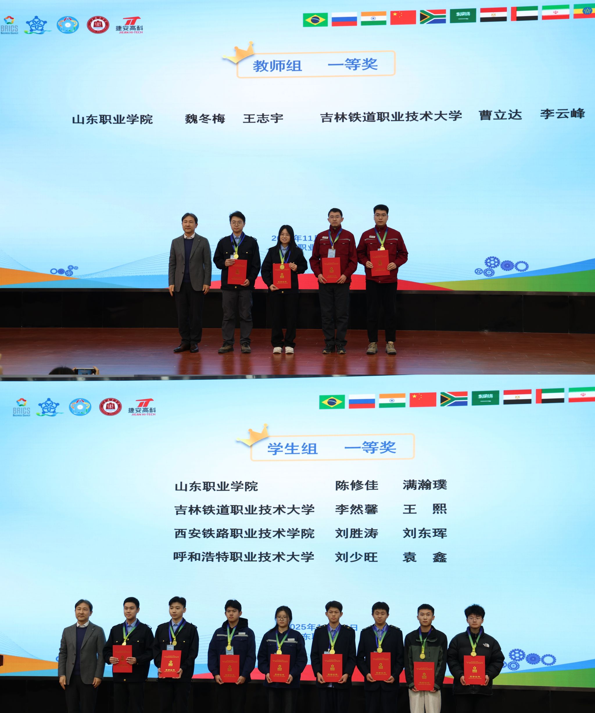 经过激烈角逐,我校与吉林铁道职业技术大学获教师组一等奖;西安铁路职业技术学院、呼和浩特职业技术大学等四所院校获教师组二等奖;柳州铁道职业技术学院、辽宁铁道职业技术学院等六所院校获教师组三等奖。我校、吉林铁道职业技术大学等四所院校获学生组一等奖;郑州铁路职业技术学院、浙江交通职业技术学院等七所院校获学生组二等奖;包头铁道职业技术学院、新疆铁道职业技术学院等十一所院校获学生组三等奖。我校及郑州捷安高科股份有限公司荣获突出贡献奖。