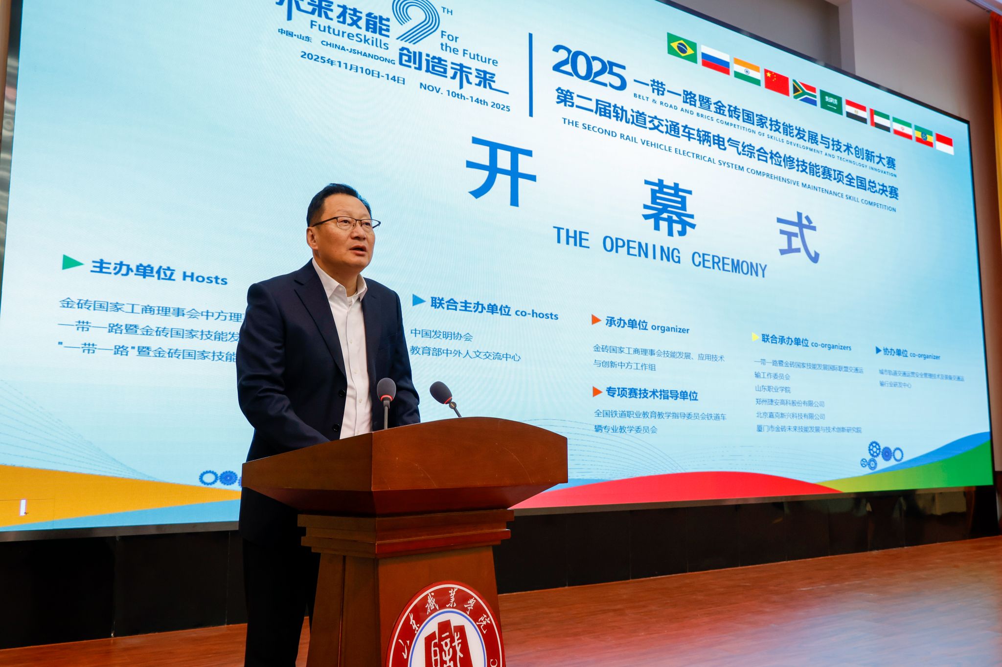 11月11日,2025一带一路暨金砖国家技能发展与技术创新大赛之第二届轨道交通车辆电气综合检修技能赛项全国总决赛在我校举行。全国铁道行业职业教育教学指导委员会铁道车辆专业委员会主任、吉林铁道职业技术大学校长曹炳志,我校党委副书记、院长郭培谦,金砖国家技能发展与技术创新大赛组委会执行委员会竞赛办公室国际处副处长高明,大赛裁判长、济南车辆段人事科长胡懂业,郑州捷安高科股份有限公司总经理高志生等嘉宾出席开幕式。开幕式由副院长李新华主持。