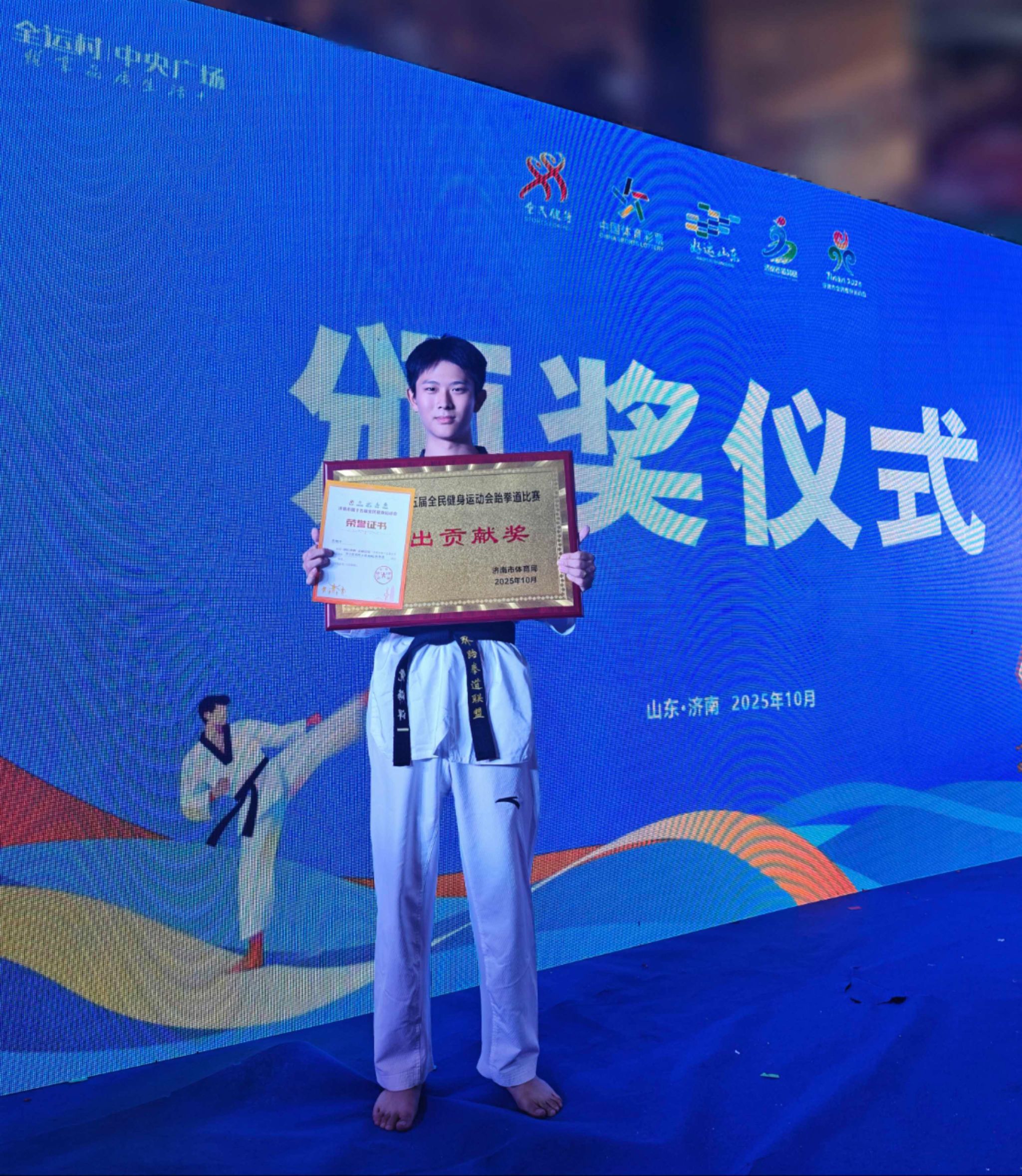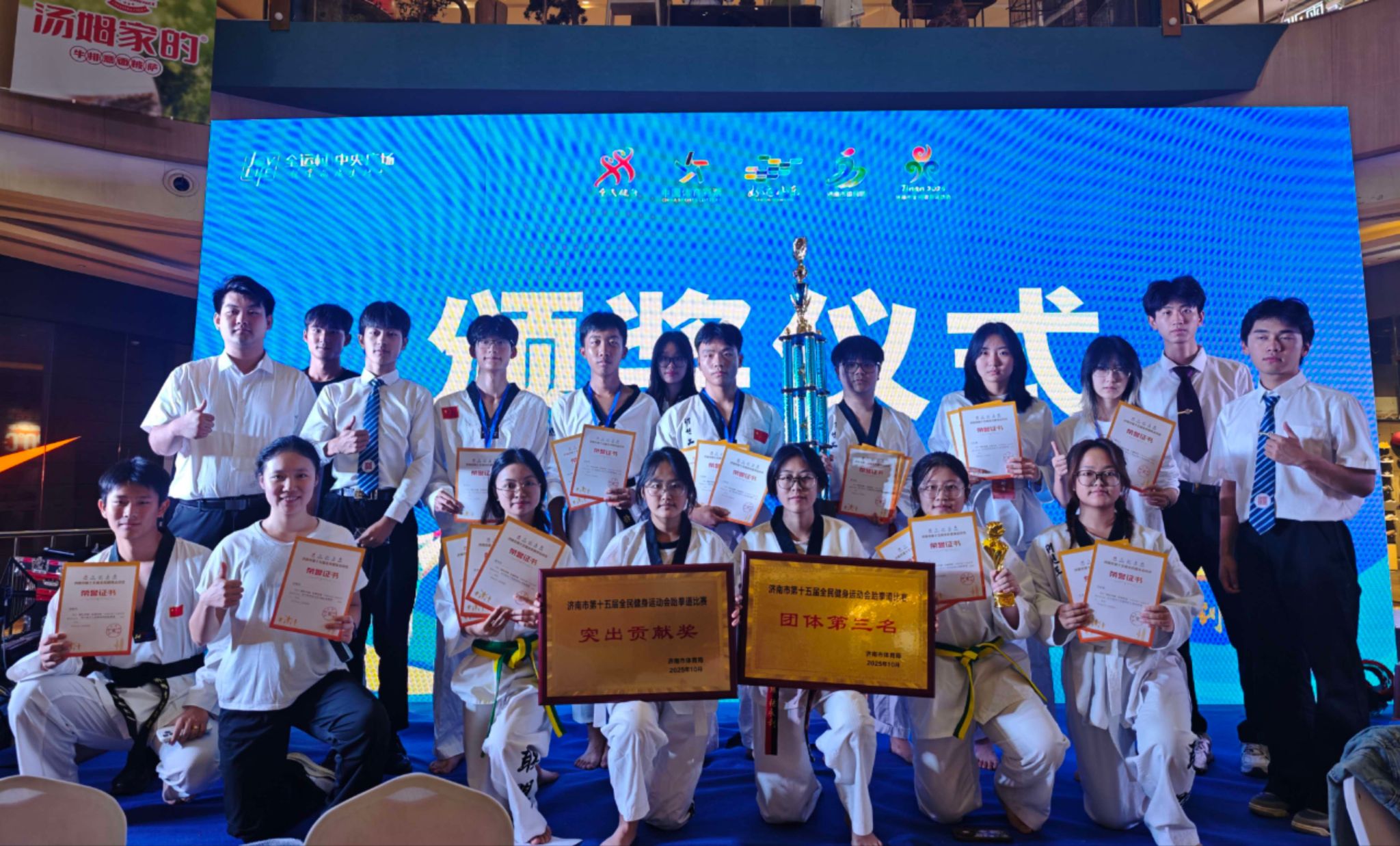 10月2日,济南市第十五届全民健身运动会在历下区全运村中央广场圆满落幕。我校跆拳道代表队在本次赛事中斩获2金1铜的优异成绩,学校荣获“赛事突出贡献奖”。
