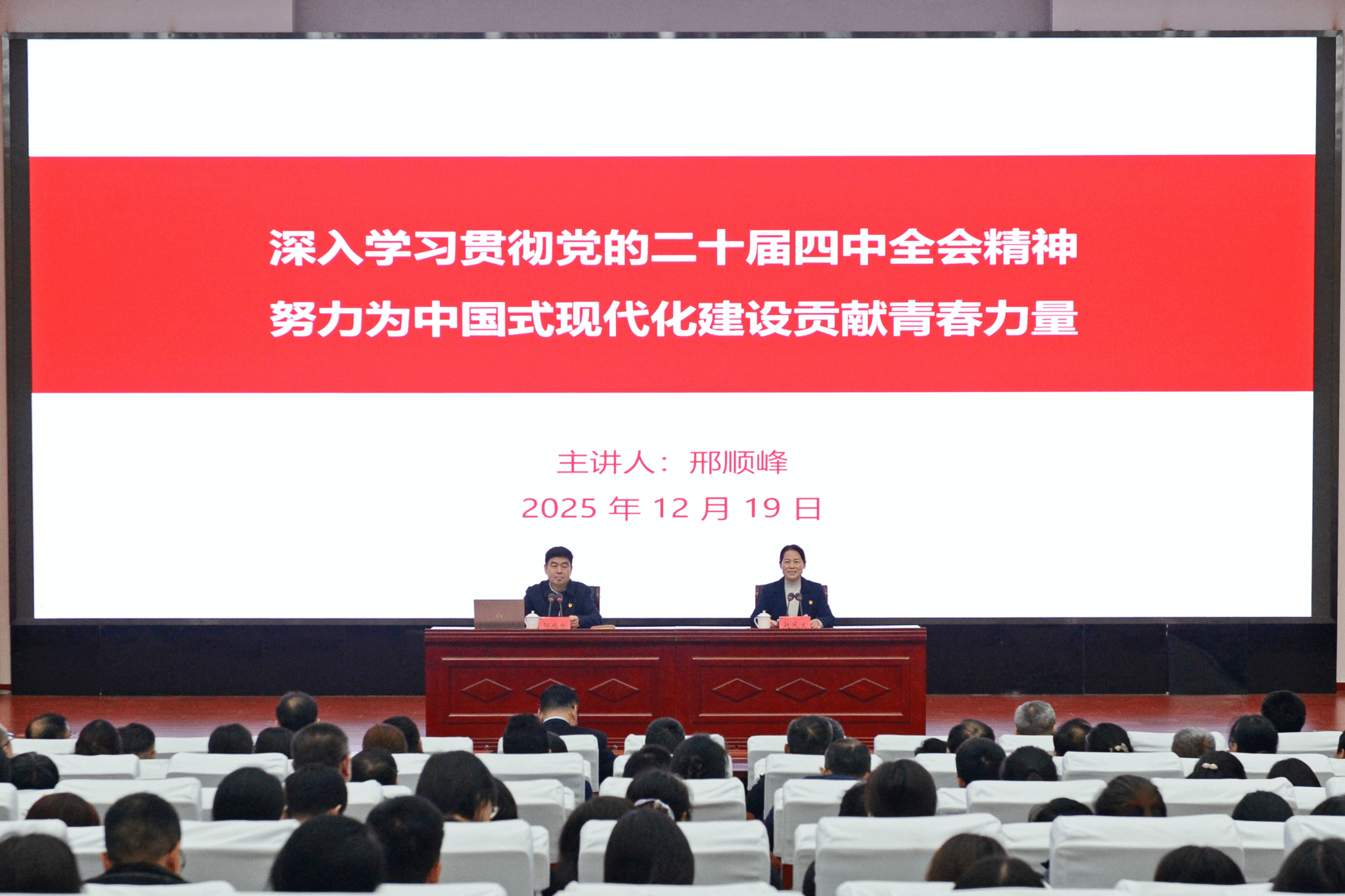 根据省委统一安排,12月19日上午,学习贯彻党的二十届四中全会精神省委宣讲团在我校宣讲。省委教育工委副书记,省教育厅党组副书记、副厅长,一级巡视员邢顺峰以《深入学习贯彻党的二十届四中全会精神 努力为中国式现代化建设贡献青春力量》为题作宣讲报告。报告会由我校党委书记赵凤文主持。