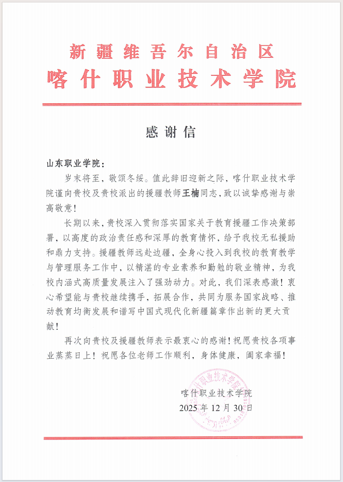 近日,我校收到新疆维吾尔自治区喀什职业技术学院发来的感谢信,信中对我校在援疆工作中的倾力支持表示诚挚感谢,对马克思主义学院援疆教师王楠的突出贡献给予高度赞扬。