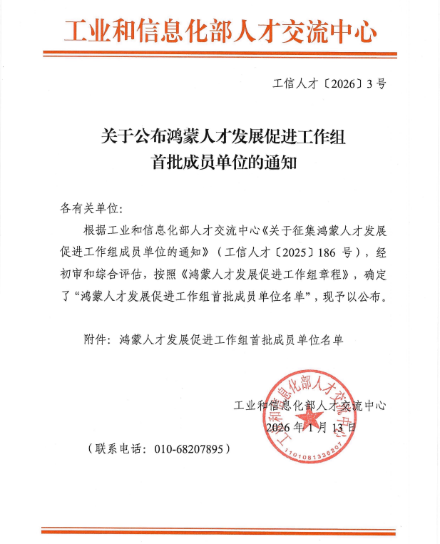 近日,工业和信息化部人才交流中心公布了鸿蒙人才发展促进工作组首批成员单位名单,我校凭借在国产自主可控技术人才培养方面的成效,成功入选首批成员单位。