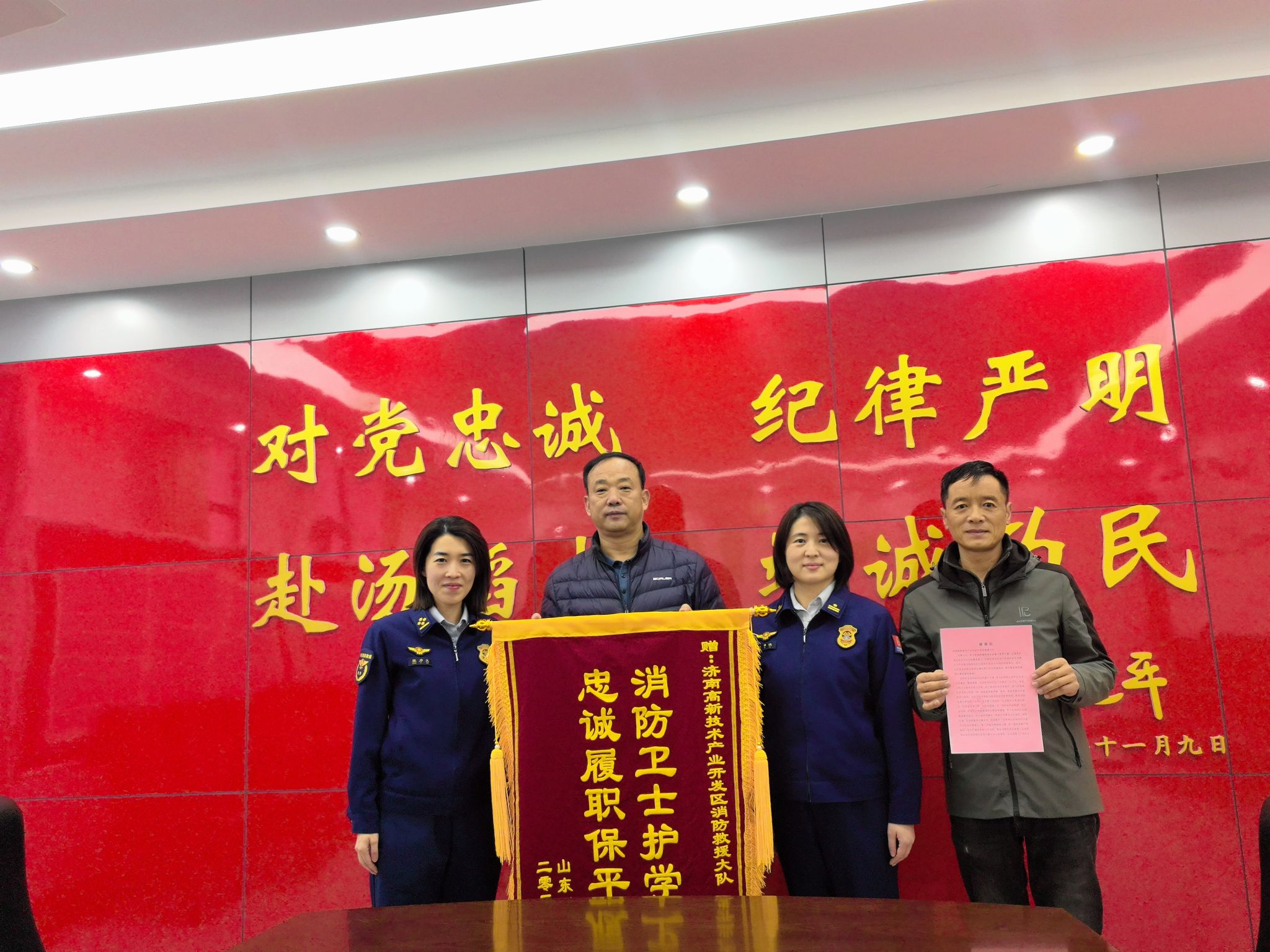 2月10日,我校安全保卫处处长吕鹏带队前往济南高新技术产业开发区消防救援大队开展走访座谈活动,并代表学院向消防救援大队赠送锦旗和感谢信,消防救援大队监督员张力文出席会见。