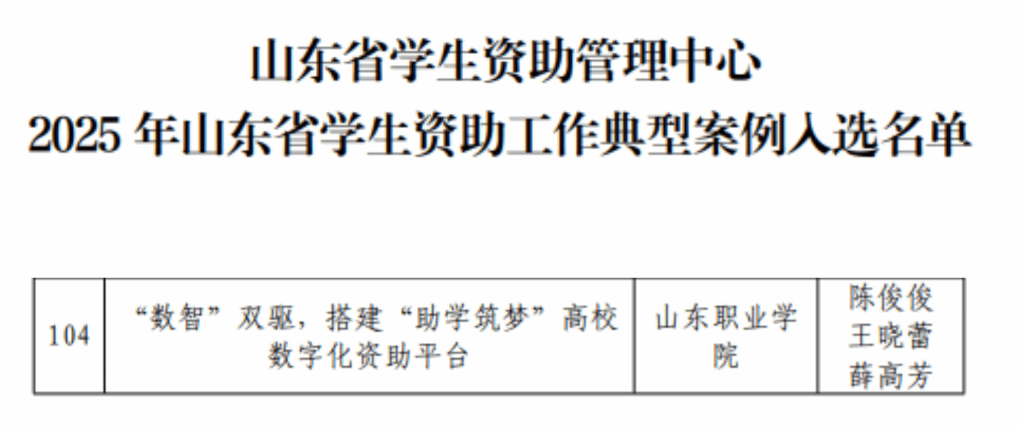 近日,山东省学生资助管理中心公布2025年山东省学生资助工作典型案例遴选结果,我校学生资助管理中心的工作案例《“数智”双驱 搭建“助学筑梦”高校数字化资助平台》成功入选。