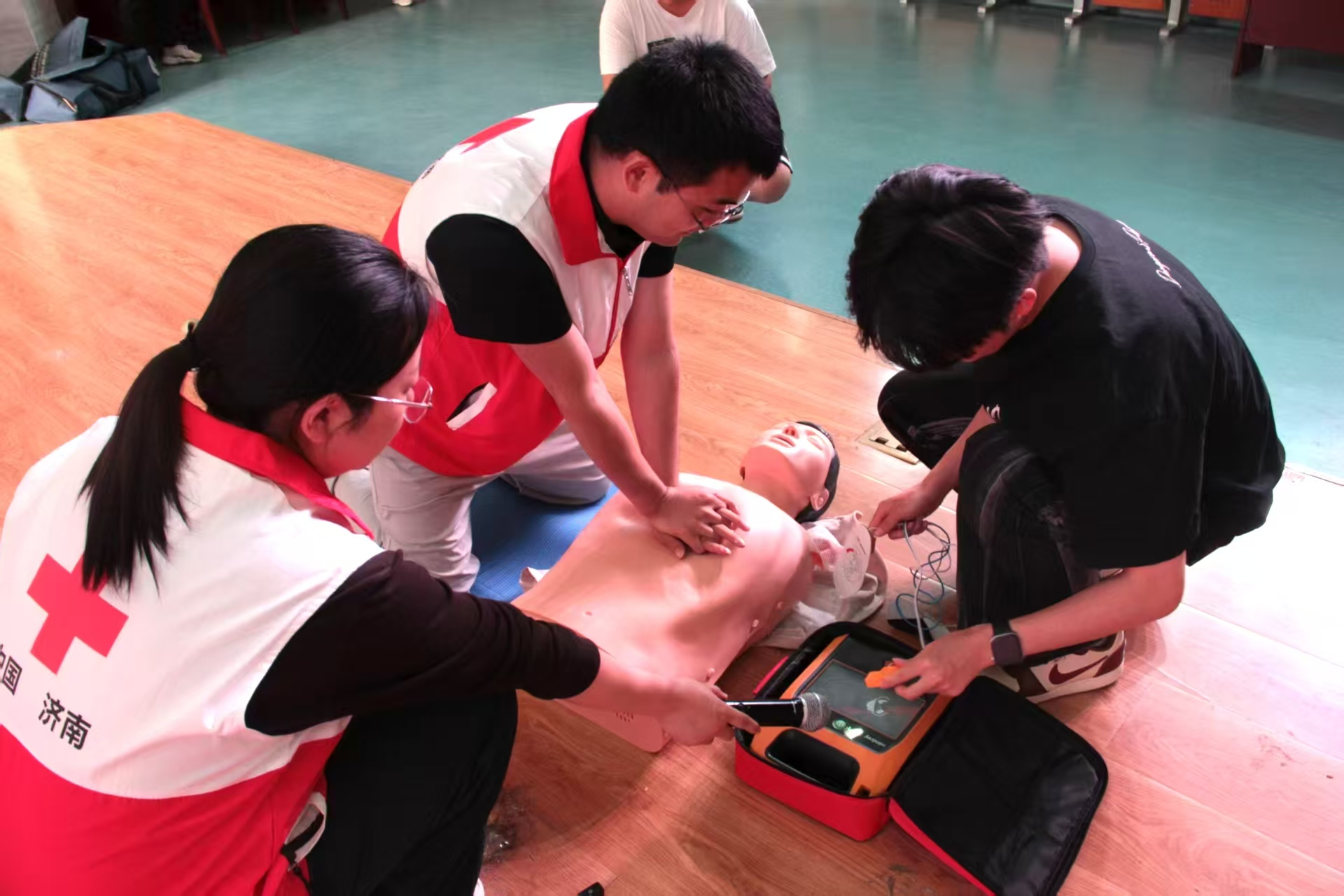 本次培训采用“理论授课+实操演练”相结合的方式进行。在理论环节,来自济南市红十字会和中心医院南丁格尔志愿服务队的专业讲师,系统讲解了应急救护的基本原则、心肺复苏操作流程、自动体外除颤器(AED)使用方法以及常见创伤的包扎技巧。生动的案例与规范的演示,让师生们对“黄金救援时间”有了更深刻的认识。