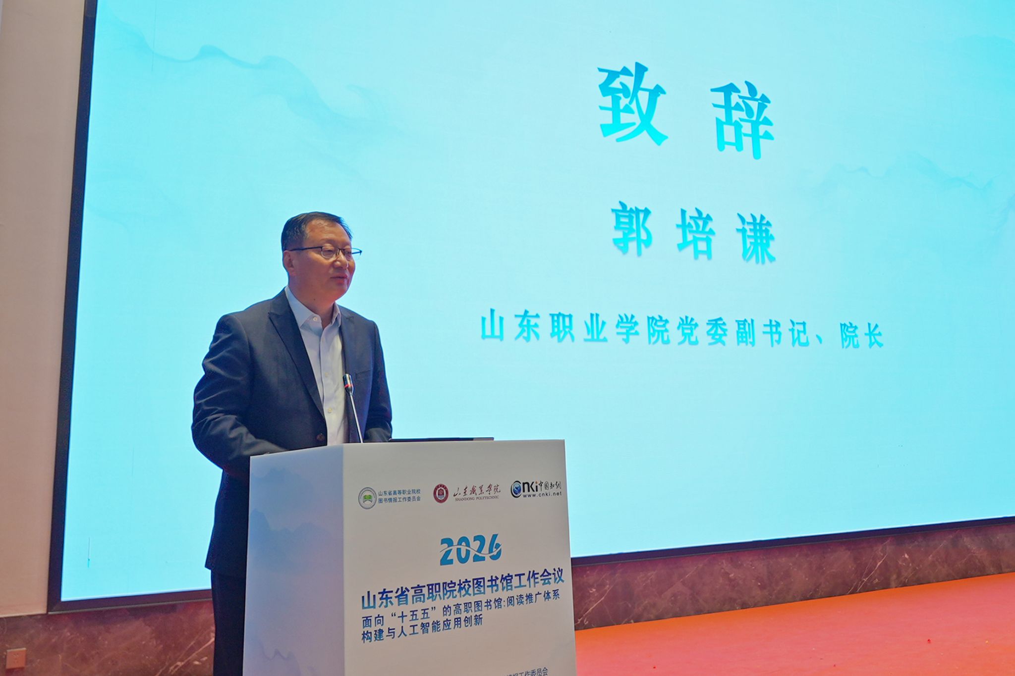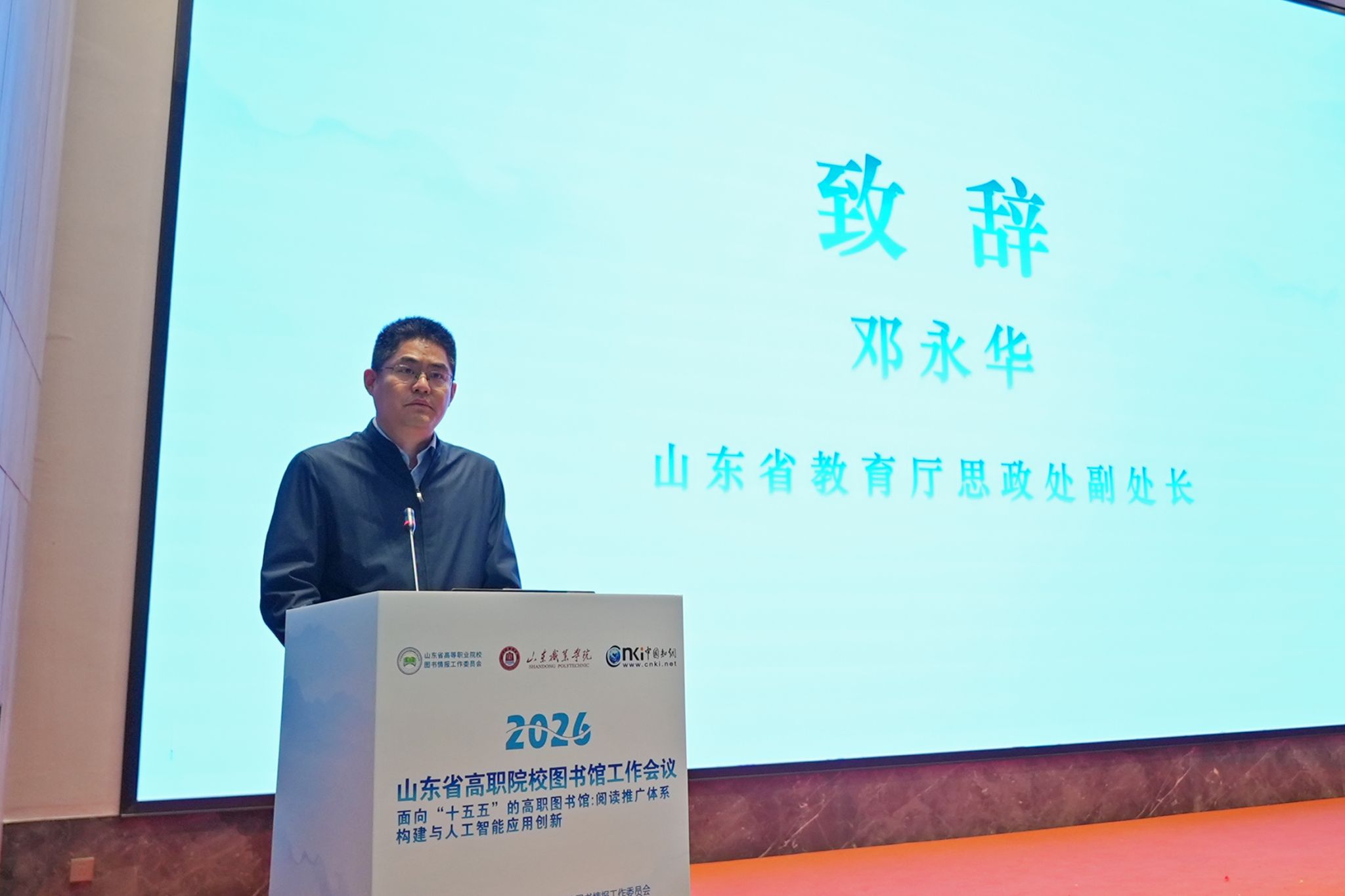 山东省教育厅思想政治工作处副处长邓永华出席会议并讲话。他强调,高职图书馆作为职业教育的重要文化阵地,要以人工智能为智慧引擎,以产教融合为发展根基,加快推进从传统文献服务中心向文化育人中心、知识服务中心、创新支持中心的转型跨越,用书香浸润校园、用文化涵养匠心,着力培育新时代“齐鲁工匠”,为职业教育高质量发展注入文化动能。