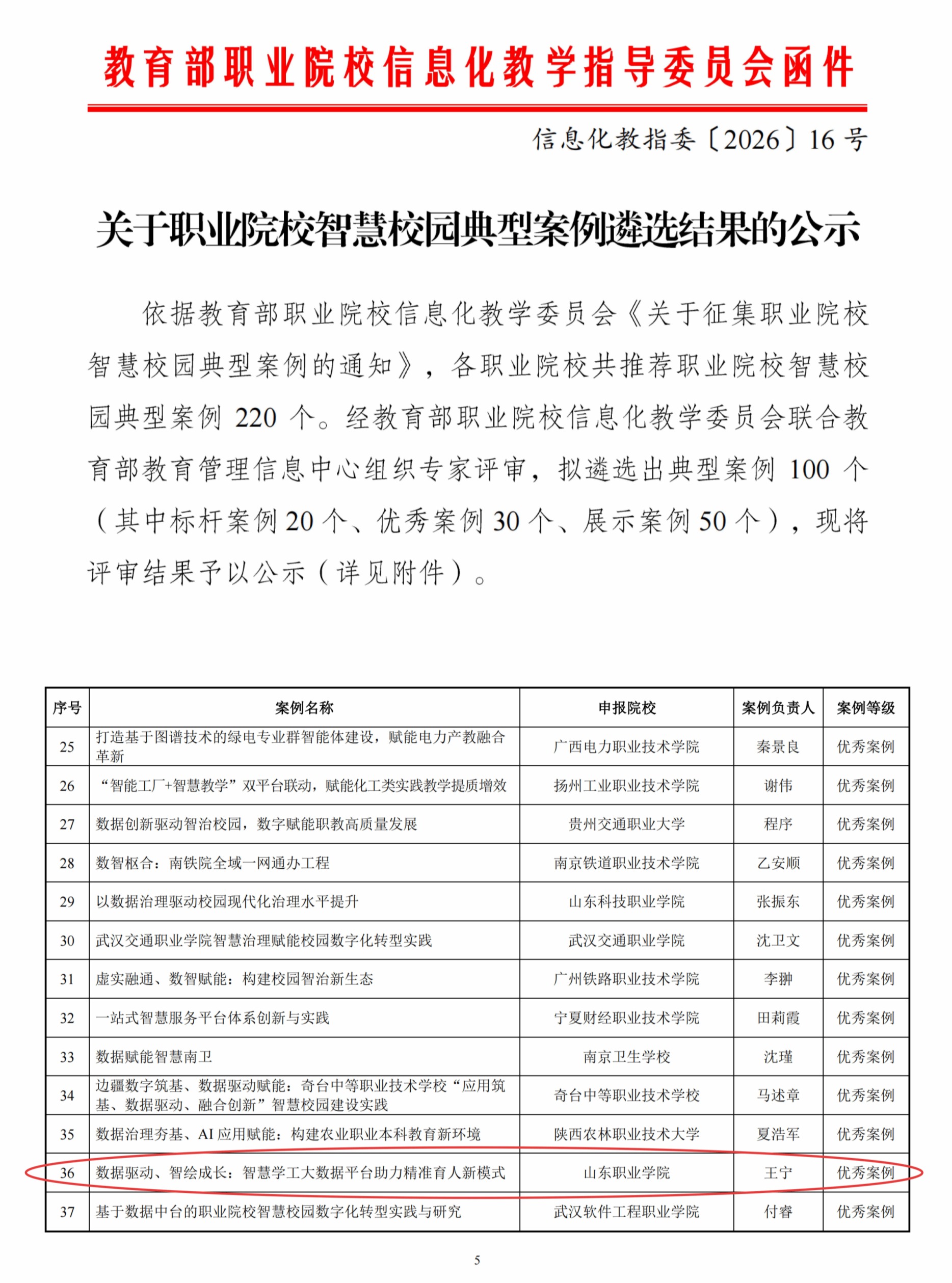 近日,教育部职业院校信息化教学指导委员会发布了《关于职业院校智慧校园典型案例遴选结果的公示》。我校东岭书院院长王宁报送的《数据驱动、智绘成长:智慧学工大数据平台助力精准育人新模式》成功入选“优秀案例”。