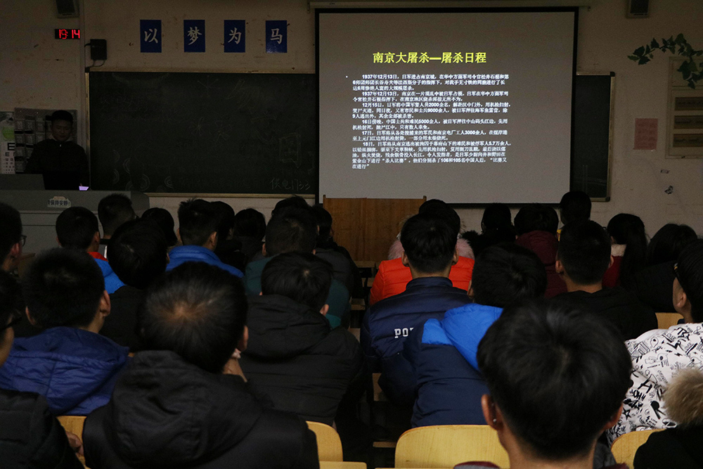 班会上,各班班长、团支书组织同学们观看南京大屠杀纪录片,缅怀所有惨遭日本侵略者杀戮的死难者同胞,缅怀为中国人民抗日战争胜利献出生命的革命先烈和民族英雄,引导大家勿忘国耻,矢志前行。
