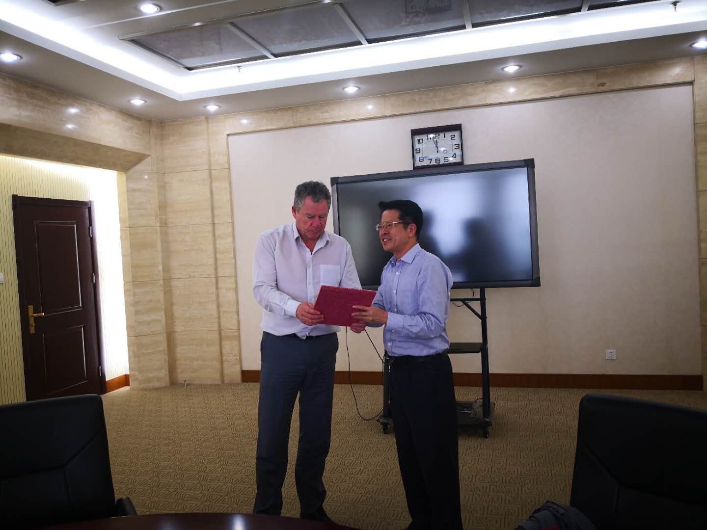 秦河对Brien部长一行表示热烈欢迎,并介绍了学院历史、专业特色、行业背景、招生就业等情况。Brien部长介绍了怀卡托理工学院的基本情况、国际交流情况、中心示范项目等。郭鹏提出了合作办学和创新创业方面的合作设想。双方就开展师资培训、合作办学、人才引进、“悉尼协议”范式国际化专业建设等事项进行了深入探讨,达成了初步合作意向。我院希望以此为契机,开展创新创业师资培训,重点推进“双创”教学,培养“双创”指导教师团队,建立“双创”学院;探索合作办学模式,继续提升我院国际化办学水平,为中新两国学生交流发展提供更多渠道和平台。会上,双方互赠了具有民族特色的礼物。