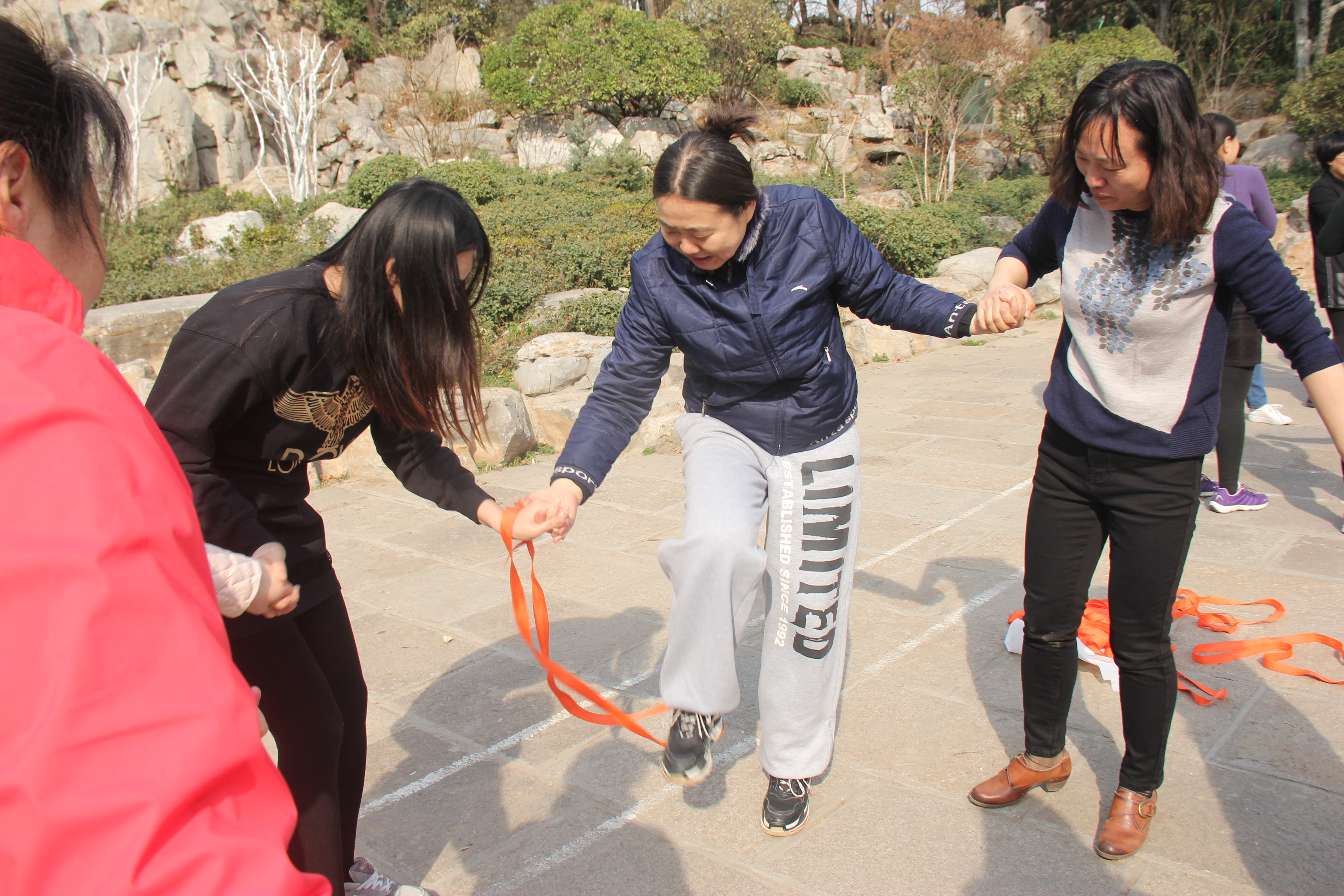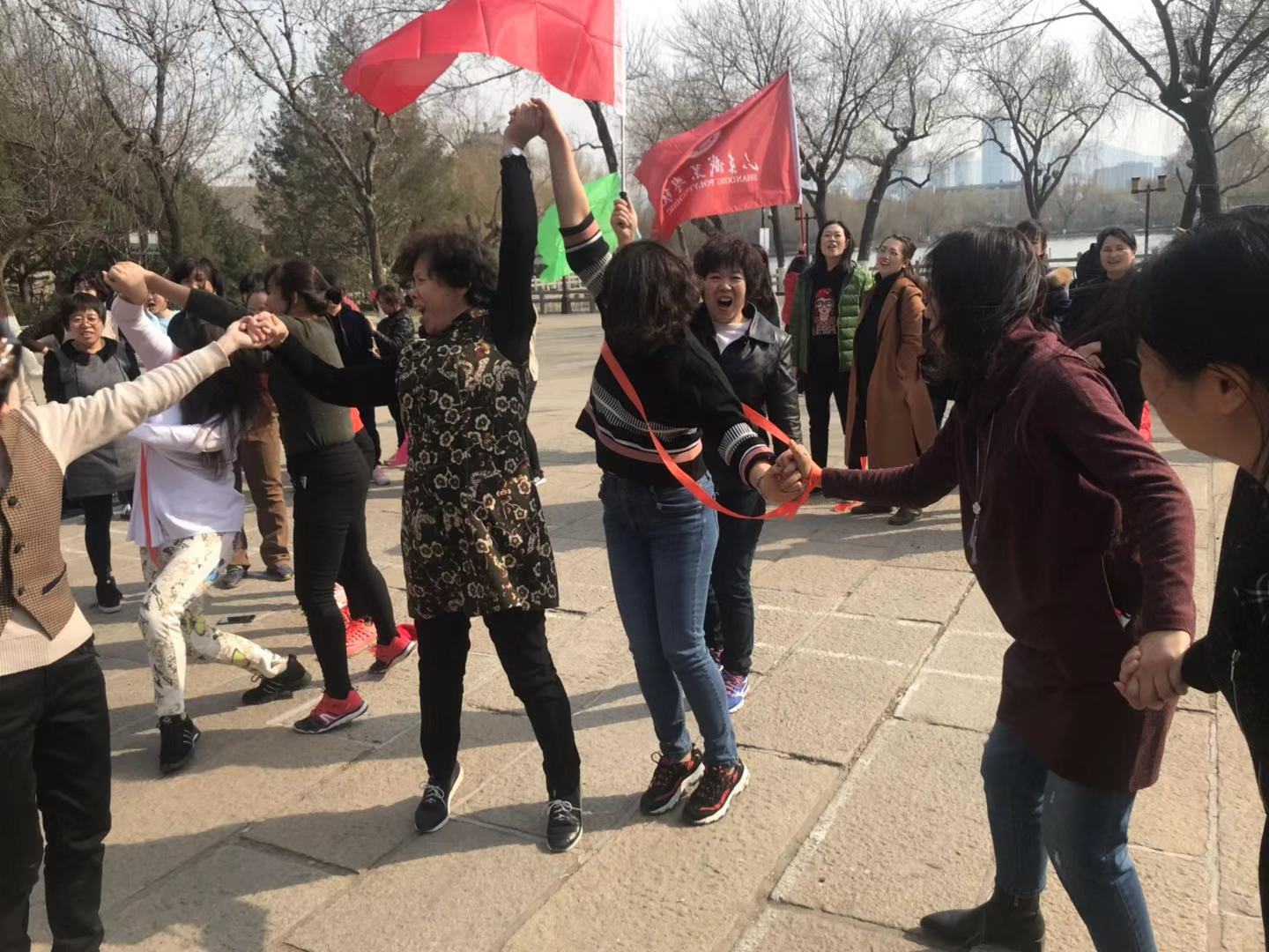 下午1点40分,全院二百余名女教职工精神饱满地欢聚大明湖北极阁东侧的自然舞台广场,活动在轻松愉悦的氛围中拉开了序幕。学院副院长祝瑞花和工会副主席赵欣分别代表学院领导和工会组织向女教职工致以节日慰问。随后,由张红妮老师带领大家进行了精心设计的拓展活动。巧解绳索这一环节趣味横生,扣人心弦,由10位老师组成一组,需要大家通过齐心协力、天衣无缝地巧妙配合才能胜利完成,经过短暂地练习,老师们各个身手矫健,那优美的身姿、灵活的动作引起大家一阵阵欢呼和惊叹。