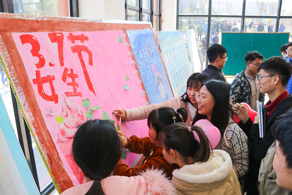“爱心便签”送祝福,“锦鲤”转发营氛围。十号教学楼大厅热闹非凡,一张贴满便利贴的画板引来围观,“愿自己能实现梦想”“愿能活成自己日记里写的样子”“愿女神每天开心快乐”……上面写满了女生们立下的flag与男生们的不停打call,语句精彩,令人动容。大厅的电视屏幕循环播放《电气最美女生》短视频,上镜的她们由2017级与2018级的优秀女生组成,其精神焕发的样子折射出女大学生蓬勃向上的精神面貌,广大学子纷纷在QQ空间、朋友圈等社交软件“刷屏”转发,将祝福场地扩大到网络,学生家长们纷纷点赞留言。