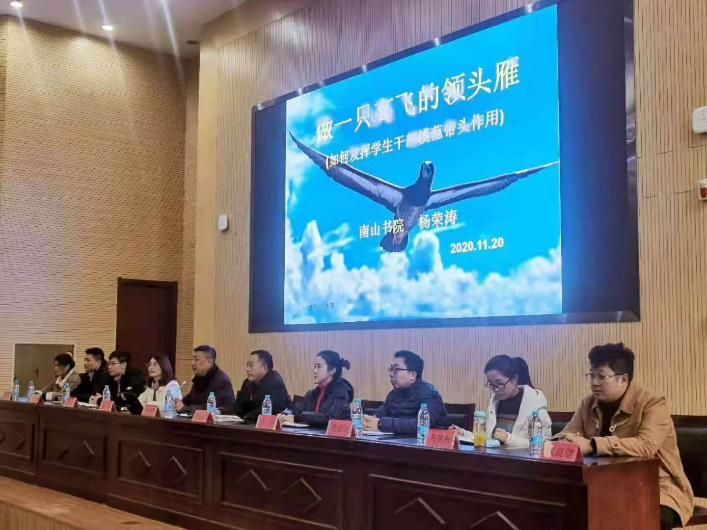 为进一步加强学生干部队伍建设,培养有能力、有素质、有担当、有责任的学生干部。11月25日下午,南山书院在图书行政楼东报告厅召开书院学生组织成立暨学生干部培训大会。南山书院院长杨荣涛、副院长栾金志及全体辅导员老师出席大会。