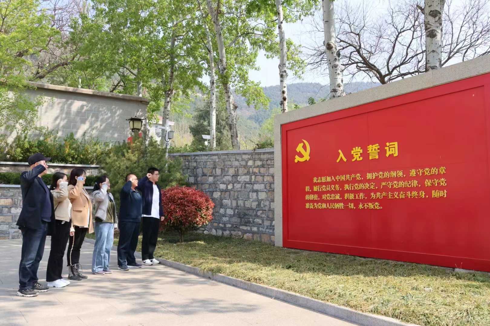 在初心广场,全体党员在于海龙老师的带领下,面向党旗庄严宣誓,更加坚定了自己忠诚于党的信念。在烈士英雄纪念碑前,全体师生带着对先烈们的崇高敬意,向先烈们深深鞠躬,依次将手中菊花摆放在纪念碑前,表达对革命先烈的深刻缅怀。